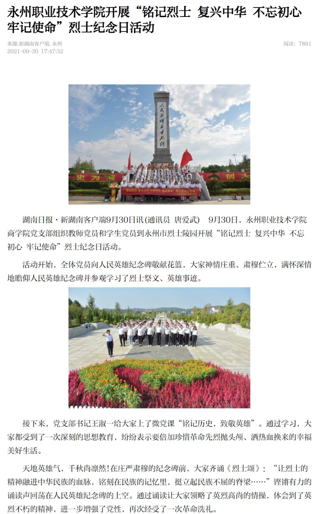 湖南日报·新湖南客户端9月30日讯(通讯员 唐爱武) 9月30日,永州职业技术学院商学院党支部组织教师党员和学生党员到永州市烈士陵园开展“铭记烈士 复兴中华 不忘初心 牢记使命”烈士纪念日活动。活动开始,全体党员向人民英雄纪念碑敬献花篮,大家神情庄重、肃穆伫立,满怀深情地瞻仰人民英雄纪念碑并参观学习了烈士祭文、英雄事迹。接下来,党支部书记王淑一给大家上了微党课“铭记历史,致敬英雄”。通过学习,大家都受到了一次深刻的思想教育,纷纷表示要倍加珍惜革命先烈抛头颅、洒热血换来的幸福美好生活。天地英雄气,千秋尚凛然!在庄严肃穆的纪念碑前,大家齐诵《烈士颂》:“让烈士的精神融进中华民族的血脉,铭刻在民族的记忆里,挺立起民族不屈的脊梁……”铿锵有力的诵读声回荡在人民英雄纪念碑的上空。通过诵读让大家领略了英烈高尚的情操,体会到了英烈不朽的精神,进一步增强了党性,再次经受了一次革命洗礼。