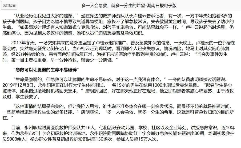 湖南日报·新湖南客户端记者 王柯沣通讯员 郑会琼 郭杰“来了来了,马上开始上课。”10月6日,在永州市社会组织孵化基地,记者见到风尘仆仆赶来的培训救护员胡斌,他是受永州职业技术学院附属医院指派的救护师资队队员。来得有些匆忙,胡斌抱歉地解释:“昨晚上晚班,清早在医院查完房、交接完工作,就立马赶过来了。” 还没来得及喝口水,胡斌便站上讲台给学员们讲课。“早一分钟抢救,就会少一分遗憾”这天,本是胡斌难得的休息日。“少休息一天,能让更多的人了解急救知识,非常值得。”胡斌笑着说,“急救就是和时间赛跑,当突发紧急情况时,如果大家掌握一定的急救技能,就能在事发现场第一时间挽救生命。”今年是胡斌加入永州职院附属医院救护师资队的第11个年头。自2011年以来,胡斌累计授课30余场,受益人员达1.5万余人。“从业经历让我见过太多的遗憾。”坐在身边的救护师资队队长卢桂云告诉记者,有一次,一对中年夫妇抱着3岁的孩子来到医院,孩子因为吃糖不慎导致气道异物梗阻,家长不了解急救常识,失去救援黄金时间,导致孩子失去了幼小的生命。“如果事发时现场有人知道海姆立克急救法,对孩子实施急救,可能结果就会不一样。”卢桂云说起当时场景,仍感到痛心。因为见到太多这样的遗憾,她和队员们迫切想要普及急救知识。2017年冬天,一场突如其来的意外更坚定了卢桂云继续推广、普及急救知识的信念。一天晚上,卢桂云的一位邻居在聚会时,突然毫无征兆地倒在地上。当卢桂云赶到现场时,看到那个人已丧失意识,情况凶险。她马上对其实施心肺复苏,经2分钟持续抢救,患者面色渐渐恢复正常,为接下来送医治疗争取到宝贵的时间。卢桂云说:“当突发事件发生时,第一目击者很重要,早一分钟抢救,就会少一分遗憾。”“急救可以让脆弱的生命不易破碎”“生命是脆弱的,但急救可以让脆弱的生命不易破碎。对于这一点我深有体会。”一旁的队员唐明辉接过话题说。2019年12月8日,永州职院正在进行大学生体能测试。一名19岁的男生在结束1000米测试后突然晕倒。“那名学生是心脏骤停,如果错过抢救时机将回天乏术。”唐明辉回忆,好在那天他正好在现场,他立即对患者实施心肺复苏,由于抢救及时,学生获救了。“这件事情的结局是完美的,但让我陷入思考,谁也说不准身体会在哪一刻突发状况,而最经不起的就是拖延时间,一些简单措施是挽救生命的必备技能。”唐明辉说,“多一人会急救,就多一分生的希望。这就是科普急救知识的目的所在。”目前,永州职院附属医院救护师资队共16人,他们活跃在幼儿园、学校、社区以及企业等处,讲授急救常识。近10年来,作为永州市红十字会初级救护培训基地,永州职院附属医院协助红十字会举办急救技能专题讲座80期,培训初级救护员5000余人;举办群众性普及初级救护知识讲座150场次,参加人员超15万人次。