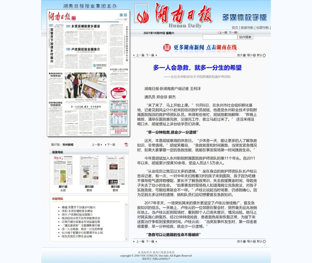 湖南日报·新湖南客户端记者 王柯沣通讯员 郑会琼 郭杰“来了来了,马上开始上课。”10月6日,在永州市社会组织孵化基地,记者见到风尘仆仆赶来的培训救护员胡斌,他是受永州职业技术学院附属医院指派的救护师资队队员。来得有些匆忙,胡斌抱歉地解释:“昨晚上晚班,清早在医院查完房、交接完工作,就立马赶过来了。” 还没来得及喝口水,胡斌便站上讲台给学员们讲课。“早一分钟抢救,就会少一分遗憾”这天,本是胡斌难得的休息日。“少休息一天,能让更多的人了解急救知识,非常值得。”胡斌笑着说,“急救就是和时间赛跑,当突发紧急情况时,如果大家掌握一定的急救技能,就能在事发现场第一时间挽救生命。”今年是胡斌加入永州职院附属医院救护师资队的第11个年头。自2011年以来,胡斌累计授课30余场,受益人员达1.5万余人。“从业经历让我见过太多的遗憾。”坐在身边的救护师资队队长卢桂云告诉记者,有一次,一对中年夫妇抱着3岁的孩子来到医院,孩子因为吃糖不慎导致气道异物梗阻,家长不了解急救常识,失去救援黄金时间,导致孩子失去了幼小的生命。“如果事发时现场有人知道海姆立克急救法,对孩子实施急救,可能结果就会不一样。”卢桂云说起当时场景,仍感到痛心。因为见到太多这样的遗憾,她和队员们迫切想要普及急救知识。2017年冬天,一场突如其来的意外更坚定了卢桂云继续推广、普及急救知识的信念。一天晚上,卢桂云的一位邻居在聚会时,突然毫无征兆地倒在地上。当卢桂云赶到现场时,看到那个人已丧失意识,情况凶险。她马上对其实施心肺复苏,经2分钟持续抢救,患者面色渐渐恢复正常,为接下来送医治疗争取到宝贵的时间。卢桂云说:“当突发事件发生时,第一目击者很重要,早一分钟抢救,就会少一分遗憾。”“急救可以让脆弱的生命不易破碎”“生命是脆弱的,但急救可以让脆弱的生命不易破碎。对于这一点我深有体会。”一旁的队员唐明辉接过话题说。2019年12月8日,永州职院正在进行大学生体能测试。一名19岁的男生在结束1000米测试后突然晕倒。“那名学生是心脏骤停,如果错过抢救时机将回天乏术。”唐明辉回忆,好在那天他正好在现场,他立即对患者实施心肺复苏,由于抢救及时,学生获救了。“这件事情的结局是完美的,但让我陷入思考,谁也说不准身体会在哪一刻突发状况,而最经不起的就是拖延时间,一些简单措施是挽救生命的必备技能。”唐明辉说,“多一人会急救,就多一分生的希望。这就是科普急救知识的目的所在。”目前,永州职院附属医院救护师资队共16人,他们活跃在幼儿园、学校、社区以及企业等处,讲授急救常识。近10年来,作为永州市红十字会初级救护培训基地,永州职院附属医院协助红十字会举办急救技能专题讲座80期,培训初级救护员5000余人;举办群众性普及初级救护知识讲座150场次,参加人员超15万人次。