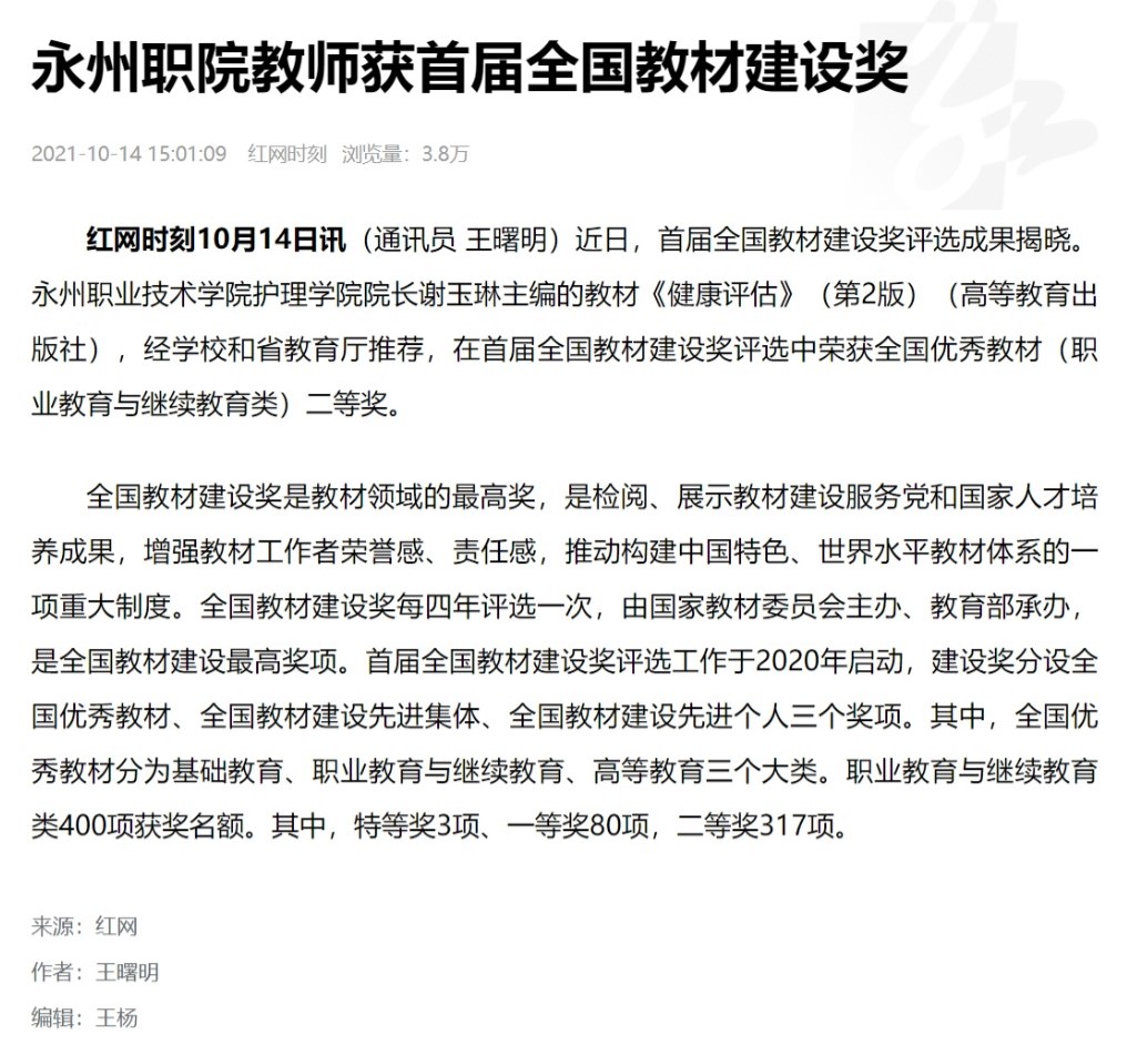 红网时刻10月14日讯(通讯员 王曙明)近日,首届全国教材建设奖评选成果揭晓。永州职业技术学院护理学院院长谢玉琳主编的教材《健康评估》(第2版)(高等教育出版社),经学校和省教育厅推荐,在首届全国教材建设奖评选中荣获全国优秀教材(职业教育与继续教育类)二等奖。
