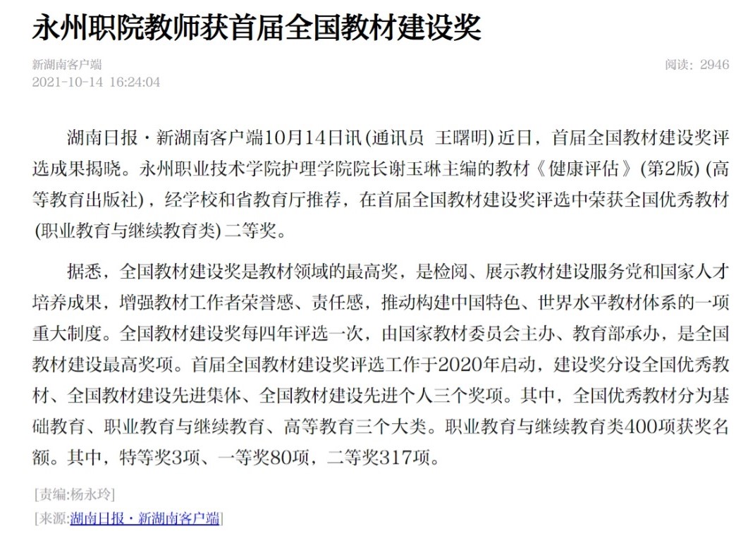 湖南日报·新湖南客户端10月14日讯(通讯员 王曙明)近日,首届全国教材建设奖评选成果揭晓。永州职业技术学院护理学院院长谢玉琳主编的教材《健康评估》(第2版)(高等教育出版社),经学校和省教育厅推荐,在首届全国教材建设奖评选中荣获全国优秀教材(职业教育与继续教育类)二等奖。据悉,全国教材建设奖是教材领域的最高奖,是检阅、展示教材建设服务党和国家人才培养成果,增强教材工作者荣誉感、责任感,推动构建中国特色、世界水平教材体系的一项重大制度。全国教材建设奖每四年评选一次,由国家教材委员会主办、教育部承办,是全国教材建设最高奖项。首届全国教材建设奖评选工作于2020年启动,建设奖分设全国优秀教材、全国教材建设先进集体、全国教材建设先进个人三个奖项。其中,全国优秀教材分为基础教育、职业教育与继续教育、高等教育三个大类。职业教育与继续教育类400项获奖名额。其中,特等奖3项、一等奖80项,二等奖317项。[责编:杨永玲]