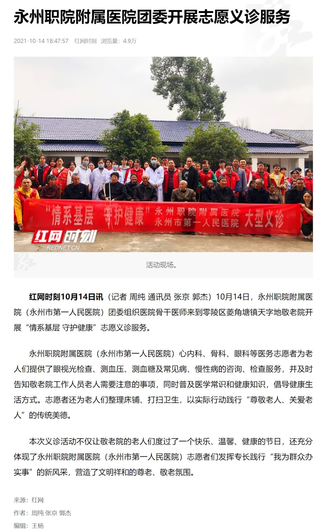 红网时刻10月14日讯(记者 周纯 通讯员 张京 郭杰)10月14日,永州职院附属医院(永州市第一人民医院)团委组织医院骨干医师来到零陵区菱角塘镇天字地敬老院开展“情系基层 守护健康”志愿义诊服务。永州职院附属医院(永州市第一人民医院)心内科、骨科、眼科等医务志愿者为老人们提供了眼视光检查、测血压、测血糖及常见病、慢性病的咨询、检查服务,并及时告知敬老院工作人员老人需要注意的事项,同时普及医学常识和健康知识,倡导健康生活方式。志愿者还为老人们整理床铺、打扫卫生,以实际行动践行“尊敬老人、关爱老人”的传统美德。本次义诊活动不仅让敬老院的老人们度过了一个快乐、温馨、健康的节日,还充分体现了永州职院附属医院(永州市第一人民医院)志愿者们发挥专长践行“我为群众办实事”的新风采,营造了文明祥和的尊老、敬老氛围。来源:红网作者:周纯 张京 郭杰编辑:王杨