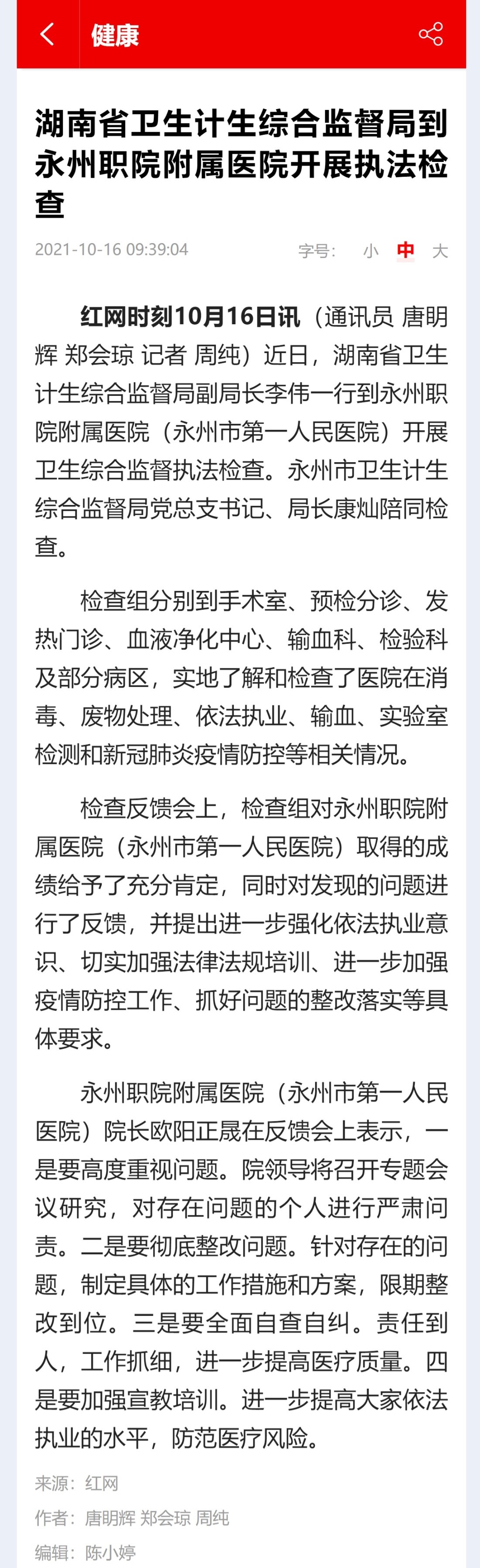 红网时刻10月16日讯(通讯员 唐眀辉 郑会琼 记者 周纯)近日,湖南省卫生计生综合监督局副局长李伟一行到永州职院附属医院(永州市第一人民医院)开展卫生综合监督执法检查。永州市卫生计生综合监督局党总支书记、局长康灿陪同检查。检查组分别到手术室、预检分诊、发热门诊、血液净化中心、输血科、检验科及部分病区,实地了解和检查了医院在消毒、废物处理、依法执业、输血、实验室检测和新冠肺炎疫情防控等相关情况。检查反馈会上,检查组对永州职院附属医院(永州市第一人民医院)取得的成绩给予了充分肯定,同时对发现的问题进行了反馈,并提出进一步强化依法执业意识、切实加强法律法规培训、进一步加强疫情防控工作、抓好问题的整改落实等具体要求。永州职院附属医院(永州市第一人民医院)院长欧阳正晟在反馈会上表示,一是要高度重视问题。院领导将召开专题会议研究,对存在问题的个人进行严肃问责。二是要彻底整改问题。针对存在的问题,制定具体的工作措施和方案,限期整改到位。三是要全面自查自纠。责任到人,工作抓细,进一步提高医疗质量。四是要加强宣教培训。进一步提高大家依法执业的水平,防范医疗风险。来源:红网作者:唐眀辉 郑会琼 周纯编辑:陈小婷