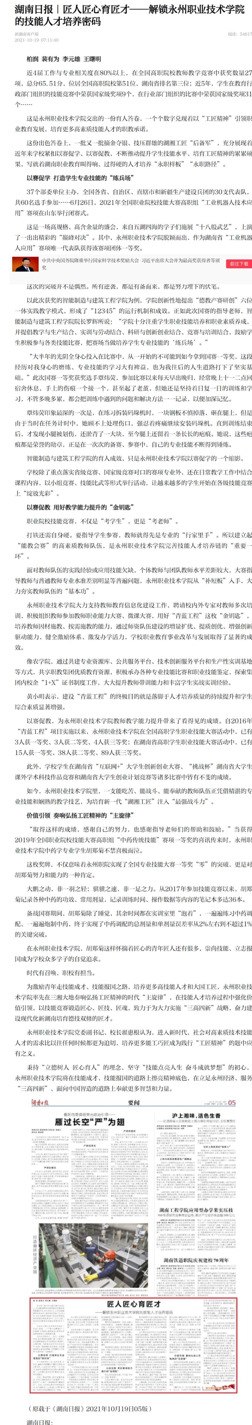 【新湖南】湖南日报|匠人匠心育匠才——解锁永州职业技术学院的技能人才培养密码