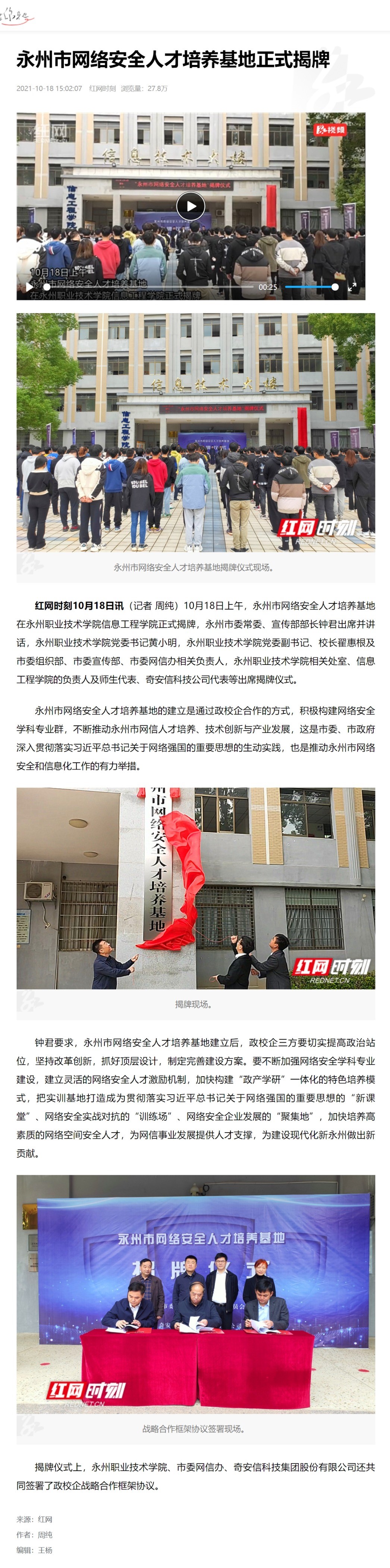 红网时刻10月18日讯(记者 周纯)10月18日上午,永州市网络安全人才培养基地在永州职业技术学院信息工程学院正式揭牌,永州市委常委、宣传部部长钟君出席并讲话,永州职业技术学院党委书记黄小明,永州职业技术学院党委副书记、校长翟惠根及市委组织部、市委宣传部、市委网信办相关负责人,永州职业技术学院相关处室、信息工程学院的负责人及师生代表、奇安信科技公司代表等出席揭牌仪式。永州市网络安全人才培养基地的建立是通过政校企合作的方式,积极构建网络安全学科专业群,不断推动永州市网信人才培养、技术创新与产业发展,这是市委、市政府深入贯彻落实习近平总书记关于网络强国的重要思想的生动实践,也是推动永州市网络安全和信息化工作的有力举措。钟君要求,永州市网络安全人才培养基地建立后,政校企三方要切实提高政治站位,坚持改革创新,抓好顶层设计,制定完善建设方案。要不断加强网络安全学科专业建设,建立灵活的网络安全人才激励机制,加快构建“政产学研”一体化的特色培养模式,把实训基地打造成为贯彻落实习近平总书记关于网络强国的重要思想的“新课堂”、网络安全实战对抗的“训练场”、网络安全企业发展的“聚集地”,加快培养高素质的网络空间安全人才,为网信事业发展提供人才支撑,为建设现代化新永州做出新贡献。永州职业技术学院、市委网信办、奇安信科技集团股份有限公司还共同签署了政校企战略合作框架协议。来源:红网作者:周纯编辑:王杨