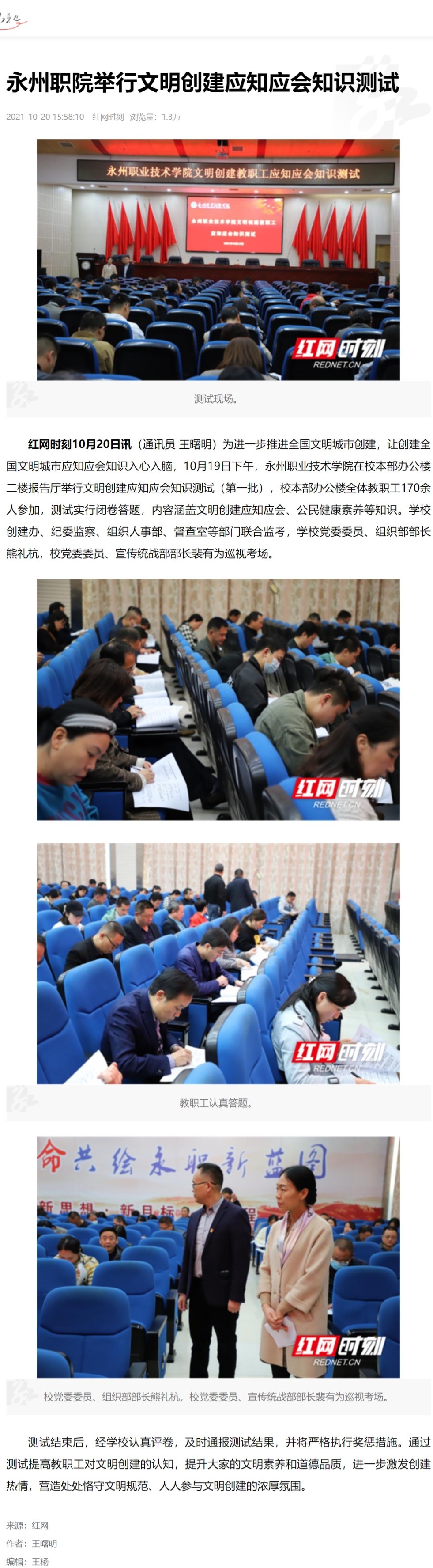 红网时刻10月20日讯(通讯员 王曙明)为进一步推进全国文明城市创建,让创建全国文明城市应知应会知识入心入脑,10月19日下午,永州职业技术学院在校本部办公楼二楼报告厅举行文明创建应知应会知识测试(第一批),校本部办公楼全体教职工170余人参加,测试实行闭卷答题,内容涵盖文明创建应知应会、公民健康素养等知识。学校创建办、纪委监察、组织人事部、督查室等部门联合监考,学校党委委员、组织部部长熊礼杭,校党委委员、宣传统战部部长裴有为巡视考场。测试结束后,经学校认真评卷,及时通报测试结果,并将严格执行奖惩措施。通过测试提高教职工对文明创建的认知,提升大家的文明素养和道德品质,进一步激发创建热情,营造处处恪守文明规范、人人参与文明创建的浓厚氛围。来源:红网作者:王曙明编辑:王杨