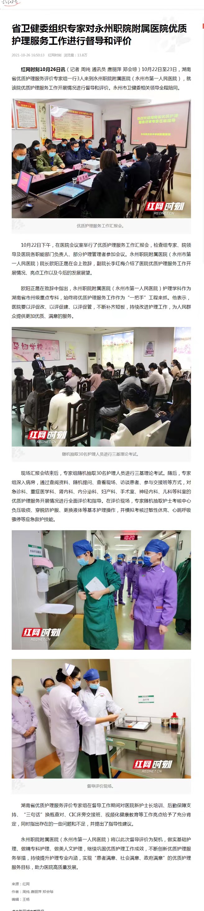 红网时刻10月26日讯(记者 周纯 通讯员 唐丽萍 郑会琼)10月22日至23日,湖南省优质护理服务评价专家组一行3人来到永州职院附属医院(永州市第一人民医院),就该院优质护理服务工作开展情况进行督导和评价。永州市卫健委相关领导全程陪同。10月22日下午,在医院会议室举行了优质护理服务工作汇报会,检查组专家、院领导及医院各职能部门负责人、部分护理管理者参加会议。永州职院附属医院(永州市第一人民医院)院长欧阳正晟在会上致辞,副院长李红梅介绍了医院优质护理服务工作开展情况、亮点工作以及今后的发展展望。欧阳正晟在致辞中指出,永州职院附属医院(永州市第一人民医院)护理学科作为湖南省市州级重点专科,始终将优质护理服务工作作为“一把手”工程来抓。他表示,医院要以评促改、以评促建、以评促管,不断补齐短板,持续改进护理工作,为人民群众提供更加优质、满意的服务。现场汇报会结束后,专家组随机抽取30名护理人员进行三基理论考试。随后,专家组深入病房,通过查阅资料、随机提问、查看现场、访谈患者、参与交接班等方式,对急诊科、重症医学科、肾内科、内分泌科、妇产科、手术室、神经内科、儿科等科室的优质护理服务开展情况进行全面评价和指导。在评价现场,专家随机抽取护士考核中心负压吸痰、穿脱防护服、更换液体等基本护理操作,并模拟考核过敏性休克、心跳呼吸骤停等应急救护技能。湖南省优质护理服务评价专家组在督导工作期间对医院新护士长培训、后勤保障支持、“三句话”换瓶查对、CIC床旁交接班、视频化健康教育等工作亮点给予了充分肯定,同时指出存在的一些问题和不足,并提出了指导性建议。永州职院附属医院(永州市第一人民医院)将以此次督导评价为契机,做实基础护理、做精专科护理、做美人文护理,继续巩固优质护理工作成效,不断创新优质护理服务举措,持续提升护理专业内涵,实现“患者满意、社会满意、政府满意”的优质护理服务目标,助力医院高质量发展。