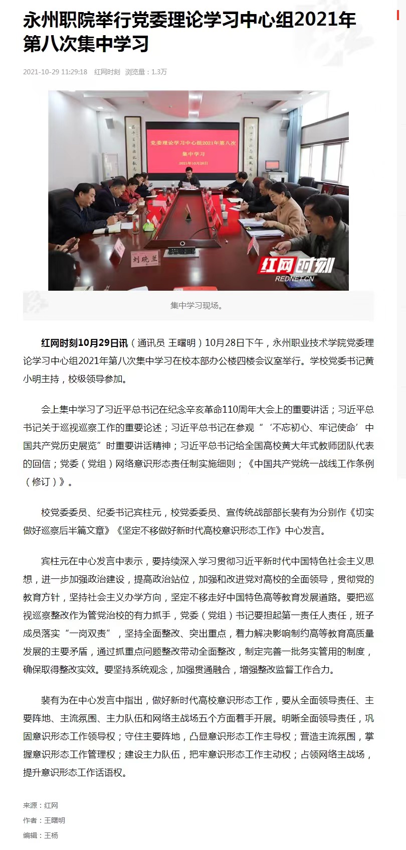 红网时刻10月29日讯(通讯员 王曙明)10月28日下午,永州职业技术学院党委理论学习中心组2021年第八次集中学习在校本部办公楼四楼会议室举行。学校党委书记黄小明主持,校级领导参加。会上集中学习了习近平总书记在纪念辛亥革命110周年大会上的重要讲话;习近平总书记关于巡视巡察工作的重要论述;习近平总书记在参观“‘不忘初心、牢记使命’中国共产党历史展览”时重要讲话精神;习近平总书记给全国高校黄大年式教师团队代表的回信;党委(党组)网络意识形态责任制实施细则;《中国共产党统一战线工作条例(修订)》。校党委委员、纪委书记宾柱元,校党委委员、宣传统战部部长裴有为分别作《切实做好巡察后半篇文章》《坚定不移做好新时代高校意识形态工作》中心发言。宾柱元在中心发言中表示,要持续深入学习贯彻习近平新时代中国特色社会主义思想,进一步加强政治建设,提高政治站位,加强和改进党对高校的全面领导,贯彻党的教育方针,坚持社会主义办学方向,坚定不移走好中国特色高等教育发展道路。要把巡视巡察整改作为管党治校的有力抓手,党委(党组)书记要担起第一责任人责任,班子成员落实“一岗双责”,坚持全面整改、突出重点,着力解决影响制约高等教育高质量发展的主要矛盾,通过抓重点问题整改带动全面整改,制定完善一批务实管用的制度,确保取得整改实效。要坚持系统观念,加强贯通融合,增强整改监督工作合力。裴有为在中心发言中指出,做好新时代高校意识形态工作,要从全面领导责任、主要阵地、主流氛围、主力队伍和网络主战场五个方面着手开展。明晰全面领导责任,巩固意识形态工作领导权;守住主要阵地,凸显意识形态工作主导权;营造主流氛围,掌握意识形态工作管理权;建设主力队伍,把牢意识形态工作主动权;占领网络主战场,提升意识形态工作话语权。
