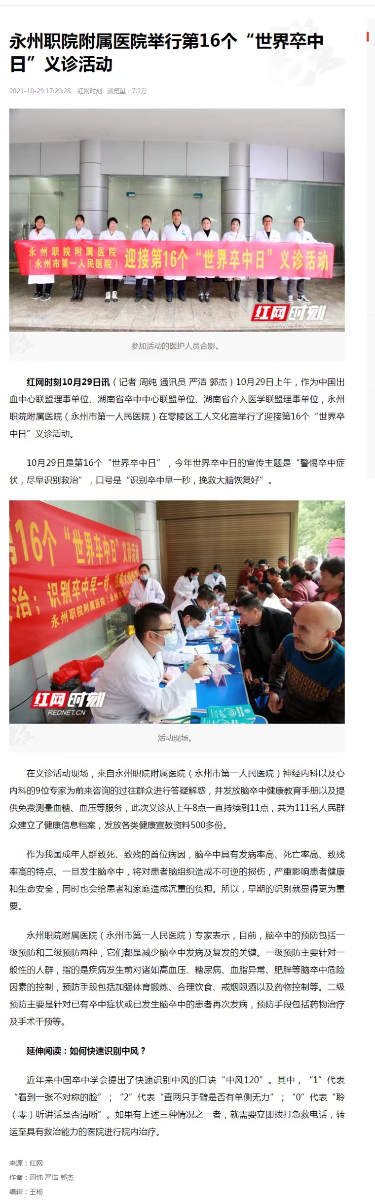 红网时刻10月29日讯(记者 周纯 通讯员 严洁 郭杰)10月29日上午,作为中国出血中心联盟理事单位、湖南省卒中中心联盟单位、湖南省介入医学联盟理事单位,永州职院附属医院(永州市第一人民医院)在零陵区工人文化宫举行了迎接第16个“世界卒中日”义诊活动。10月29日是第16个“世界卒中日”,今年世界卒中日的宣传主题是“警惕卒中症状,尽早识别救治”,口号是“识别卒中早一秒,挽救大脑恢复好”。在义诊活动现场,来自永州职院附属医院(永州市第一人民医院)神经内科以及心内科的9位专家为前来咨询的过往群众进行答疑解惑,并发放脑卒中健康教育手册以及提供免费测量血糖、血压等服务,此次义诊从上午8点一直持续到11点,共为111名人民群众建立了健康信息档案,发放各类健康宣教资料500多份。作为我国成年人群致死、致残的首位病因,脑卒中具有发病率高、死亡率高、致残率高的特点。一旦发生脑卒中,将对患者脑组织造成不可逆的损伤,严重影响患者健康和生命安全,同时也会给患者和家庭造成沉重的负担。所以,早期的识别就显得更为重要。永州职院附属医院(永州市第一人民医院)专家表示,目前,脑卒中的预防包括一级预防和二级预防两种,它们都是减少脑卒中发病及复发的关键。一级预防主要针对一般性的人群,指的是疾病发生前对诸如高血压、糖尿病、血脂异常、肥胖等脑卒中危险因素的控制,预防手段包括加强体育锻炼、合理饮食、戒烟限酒以及药物控制等。二级预防主要是针对已有卒中症状或已发生脑卒中的患者再次发病,预防手段包括药物治疗及手术干预等。延伸阅读:如何快速识别中风?近年来中国卒中学会提出了快速识别中风的口诀“中风120”。其中,“1”代表“看到一张不对称的脸”;“2”代表“查两只手臂是否有单侧无力”;“0”代表“聆(零)听讲话是否清晰”。如果有上述三种情况之一者,就需要立即拨打急救电话,转运至具有救治能力的医院进行院内治疗。