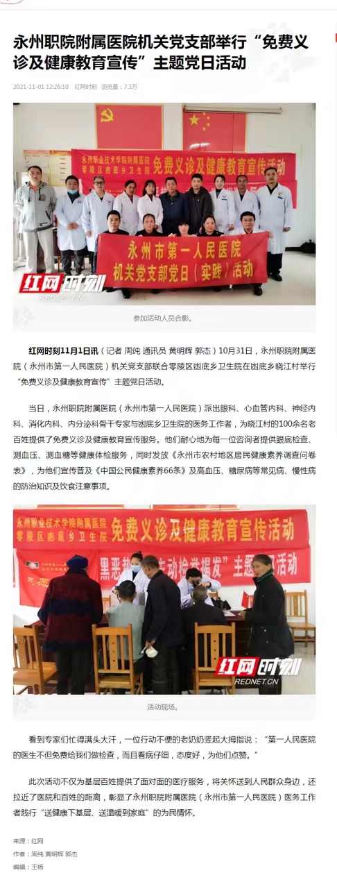 红网时刻11月1日讯(记者 周纯 通讯员 黄明辉 郭杰)10月31日,永州职院附属医院(永州市第一人民医院)机关党支部联合零陵区凼底乡卫生院在凼底乡晓江村举行“免费义诊及健康教育宣传”主题党日活动。当日,永州职院附属医院(永州市第一人民医院)派出眼科、心血管内科、神经内科、消化内科、内分泌科骨干专家与凼底乡卫生院的医务工作者,为晓江村的100余名老百姓提供了免费义诊及健康教育宣传服务。他们耐心地为每一位咨询者提供眼底检查、测血压、测血糖等健康体检服务,同时发放《永州市农村地区居民健康素养调查问卷表》,为他们宣传普及《中国公民健康素养66条》及高血压、糖尿病等常见病、慢性病的防治知识及饮食注意事项。看到专家们忙得满头大汗,一位行动不便的老奶奶竖起大拇指说:“第一人民医院的医生不但免费给我们做检查,而且看病仔细,态度好,为他们点赞。”此次活动不仅为基层百姓提供了面对面的医疗服务,将关怀送到人民群众身边,还拉近了医院和百姓的距离,彰显了永州职院附属医院(永州市第一人民医院)医务工作者践行“送健康下基层、送温暖到家庭”的为民情怀。