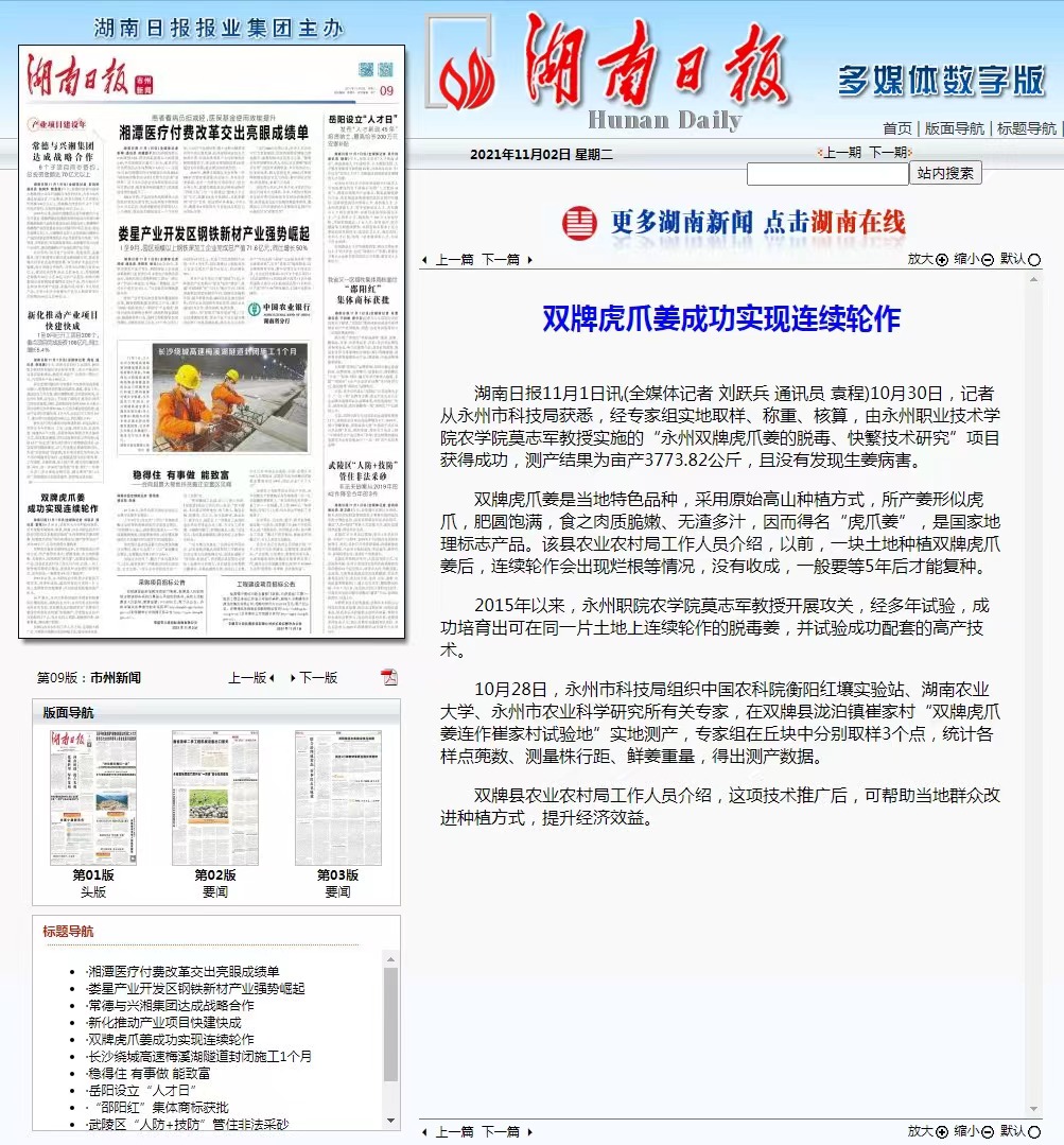 湖南日报11月1日讯(全媒体记者 刘跃兵 通讯员 袁程)10月30日,记者从永州市科技局获悉,经专家组实地取样、称重、核算,由永州职业技术学院农学院莫志军教授实施的“永州双牌虎爪姜的脱毒、快繁技术研究”项目获得成功,测产结果为亩产3773.82公斤,且没有发现生姜病害。双牌虎爪姜是当地特色品种,采用原始高山种植方式,所产姜形似虎爪,肥圆饱满,食之肉质脆嫩、无渣多汁,因而得名“虎爪姜”,是国家地理标志产品。该县农业农村局工作人员介绍,以前,一块土地种植双牌虎爪姜后,连续轮作会出现烂根等情况,没有收成,一般要等5年后才能复种。2015年以来,永州职院农学院莫志军教授开展攻关,经多年试验,成功培育出可在同一片土地上连续轮作的脱毒姜,并试验成功配套的高产技术。10月28日,永州市科技局组织中国农科院衡阳红壤实验站、湖南农业大学、永州市农业科学研究所有关专家,在双牌县泷泊镇崔家村“双牌虎爪姜连作崔家村试验地”实地测产,专家组在丘块中分别取样3个点,统计各样点蔸数、测量株行距、鲜姜重量,得出测产数据。双牌县农业农村局工作人员介绍,这项技术推广后,可帮助当地群众改进种植方式,提升经济效益。