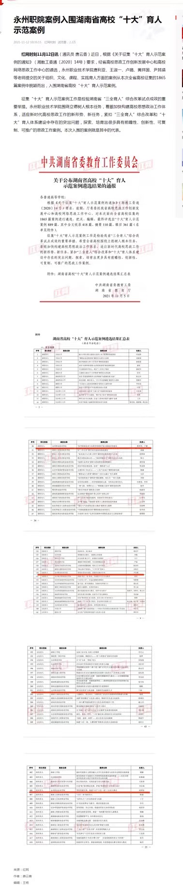 红网时刻11月12日讯(通讯员 唐云香)近日,根据《关于征集“十大”育人示范案例的通知》(湘教工委通〔2020〕14号)要求,经省高校思政工作创新发展中心和高校网络思政工作中心的遴选,永州职业技术学院唐利亚、王淑一、卢璐、黄祥国、尹其磷等老师提交的关于组织、文化、课程、实践育人方面的案例从本次全省高校征集的1865篇案例中脱颖而出,入围湖南省高校“十大”育人示范案例。征集“十大”育人示范案例工作是检验湖南省“三全育人”综合改革试点成效的重要举措。永州职业技术学院围绕立德树人根本任务,着眼加快构建高校思想政治工作体系,适应新时代高校思政工作的新形势、新任务,紧扣“三全育人”综合改革和“十大”育人体系建设中存在的突出问题,探索、培育出很多具有前瞻性、创新性、可复制、可推广的思政工作案例。本次入围的案例就是其中的代表。来源:红网作者:唐云香编辑:王杨