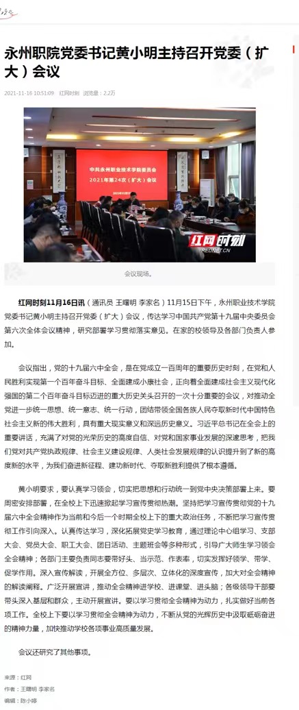 红网时刻11月16日讯(通讯员 王曙明 李家名)11月15日下午,永州职业技术学院党委书记黄小明主持召开党委(扩大)会议,传达学习中国共产党第十九届中央委员会第六次全体会议精神,研究部署学习贯彻落实意见。在家的校领导及各部门负责人参加。会议指出,党的十九届六中全会,是在党成立一百周年的重要历史时刻,在党和人民胜利实现第一个百年奋斗目标、全面建成小康社会,正向着全面建成社会主义现代化强国的第二个百年奋斗目标迈进的重大历史关头召开的一次十分重要的会议,对推动全党进一步统一思想、统一意志、统一行动,团结带领全国各族人民夺取新时代中国特色社会主义新的伟大胜利,具有重大现实意义和深远历史意义。习近平总书记在全会上的重要讲话,充满了对党的光荣历史的高度自信、对党和国家事业发展的深邃思考,把我们党对共产党执政规律、社会主义建设规律、人类社会发展规律的认识提升到了新的高度新的水平,为我们奋进新征程、建功新时代、夺取新胜利提供了根本遵循。黄小明要求,要认真学习领会,切实把思想和行动统一到党中央决策部署上来。要周密安排部署,在全校上下迅速掀起学习宣传贯彻热潮。坚持把学习宣传贯彻党的十九届六中全会精神作为当前和今后一个时期全校上下的重大政治任务,不断把学习宣传贯彻工作引向深入。认真传达学习,深化拓展党史学习教育,通过理论中心组学习、支部大会、党员大会、职工大会、团日活动、主题班会等多种形式,引导广大师生学习领会全会精神;各部门主要负责同志要带好头、当示范、作表率,切实发挥好领学、带学、促学作用。深入宣传解读,开展全方位、多层次、立体化的深度宣传,加大对全会精神的解读阐释。广泛开展宣讲,推动全会精神进学校、进课堂、进头脑;各级领导干部要带头深入基层和群众,主动开展宣讲。要以学习贯彻全会精神为动力,扎实做好当前各项工作。全校上下要以学习贯彻全会精神为动力,不断从党的光辉历史中汲取砥砺奋进的精神力量,加快推动学校各项事业高质量发展。会议还研究了其他事项。来源:红网作者:王曙明 李家名编辑:陈小婷