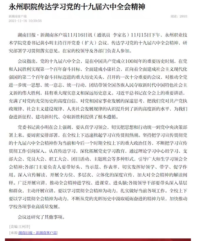 湖南日报·新湖南客户端11月16日讯(通讯员 李家名)11月15日下午,永州职业技术学院党委书记黄小明主持召开党委(扩大)会议,传达学习党的十九届六中全会精神,研究部署学习贯彻落实意见。在家的校领导及各部门负责人参加。会议指出,党的十九届六中全会,是在中国共产党成立100周年的重要历史时刻,在党和人民胜利实现第一个百年奋斗目标、全面建成小康社会,正向着全面建成社会主义现代化强国的第二个百年奋斗目标迈进的重大历史关头,召开的一次十分重要的会议,对推动全党进一步统一思想、统一意志、统一行动,团结带领全国各族人民夺取新时代中国特色社会主义新的伟大胜利,具有重大现实意义和深远历史意义。习近平总书记在全会上的重要讲话,充满了对党的光荣历史的高度自信、对党和国家事业发展的深邃思考,把我们党对共产党执政规律、社会主义建设规律、人类社会发展规律的认识提升到了新的高度新的水平,为我们奋进新征程、建功新时代、夺取新胜利提供了根本遵循。党委书记黄小明在会上强调,要认真学习领会,切实把思想和行动统一到党中央决策部署上来。要周密安排部署,在全校上下迅速掀起学习宣传贯彻热潮。坚持把学习宣传贯彻党的十九届六中全会精神作为当前和今后一个时期全校上下的重大政治任务,不断把学习宣传贯彻工作引向深入。认真传达学习,深化拓展党史学习教育,通过理论学习中心组学习、支部大会、党员大会、职工大会、团日活动、主题班会等多种形式,引导广大师生学习领会全会精神;各部门主要负责人要带好头、当示范、作表率,切实发挥好领学、带学、促学作用。深入宣传解读,开展全方位、多层次、立体化的深度宣传,加大对全会精神的解读阐释。广泛开展宣讲,推动全会精神进学校、进课堂、进头脑;各级领导干部要带头深入基层和群众,主动开展宣讲。要以学习贯彻全会精神为动力,扎实做好当前各项工作。全校上下要以学习贯彻全会精神为动力,不断从党的光辉历史中汲取砥砺奋进的精神力量,加快推动学校各项事业高质量发展。会议还研究了其他事项。[责编:王柯沣]
