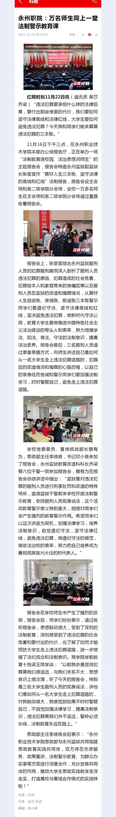 红网时刻11月22日讯(通讯员 吴莎 乔梁)“违法犯罪要承担什么样的法律后果,要付出那些惨重的代价,我们要如何坚守法律底线和法律红线,大学生要如何避免违法犯罪?今天我和同学们就来算算违法犯罪的三本账。”11月16日下午三点,在永州职业技术学院本部办公楼报告厅,正在举办一场“法制教育进校园、法治思想润师生”的主题报告会,报告会特邀永州监狱副监狱长张垂富作“算好人生三本账、坚守法律的底线和红线”法制报告,报告会设主会场和各二级学院分会场,全校一万多名师生在主会场和各二级学院分会场通过直播收看报告会。报告会上,张垂富结合永州监狱服刑人员的犯罪服刑案例深入剖析了服刑人员违法犯罪的原由、犯罪造成的社会危害、犯罪给本人和家庭带来的惨痛后果以及服刑人员在监狱的改造和悔罪情况,从算好人生自由账、亲情账、前途账三本账警示同学们要遵纪守法、坚守法律底线和红线,坚决避免违法犯罪,做新时代守法公民,教育大学生要做推进中国特色社会主义法治建设的带头人和表率,努力增强学法、知法、尊法、守法的法制意识,提高法治素养。报告会最后,三名服刑人员通过录音录播方式,向师生讲述自己是如何从一名大学生走上违法犯罪道路的,犯罪后的改造情况和悔罪的心路历程,以自己的亲身经历告诫和警示同学们要加强法制学习,时时警醒自己,避免走上违法犯罪道路。学校党委委员、宣传统战部长裴有为,思政部主任李德良,书记邓小善参加了报告会,永州监狱教育改造科科长乔梁等六位干警一同参加报告会,裴有为在报告会总结讲话中指出:“监狱是对违法犯罪的服刑人员进行刑事处罚和改造的特殊场所,邀请监狱干警前来学校开展法制警示教育,安排服刑人员现身说法,这个活动教育警示意义特别重大,相信对同学们会产生强烈的教育警示作用。希望同学们以这次讲座为契机,加强法律学习,培养法制意识,自觉遵纪守法,坚守法律红线,避免违法犯罪,做遵纪守法的模范,做依法治校的表率,努力把自己培养成为勇担民族复兴大任的时代新人。”报告会在学校师生中产生了强烈的反响,报告会后,同学们纷纷表示,通过收听报告会,思想触动很大,受到了深刻的法制教育,深刻感受到了违法犯罪的社会危害和要付出的代价,也了解了如何才能预防大学生走上违法犯罪道路,进一步增强了法纪观念和法制意识。商学院学前教育十班梁玉同学说:“以前我总是觉得犯罪离我们很遥远,与我们关系不大,思想意识上很淡薄,听了今天的报告会,特别是三名大学生服刑人员的现身说法,讲他们是如何从一名大学生走上犯罪道路的,对我触动很大,我感觉到如果不时时警醒自己,不自觉加强法律学习,提高法制意识,违法犯罪离我们并不遥远,警钟必须长鸣,法制教育永远在路上。”思政部主任李德良会后表示:“永州职业技术学院思政部与永州监狱共同组建思政教育实践共同体,双方将在志愿服务、政策宣讲、法制警示教育、为群众办实事等方面进行深度合作,充分发挥共同体的作用,推动大学生思政实践教学走深走实,打造高校与高墙合作模式的实践样板!”来源:红网作者:吴莎 乔梁编辑:陈小婷