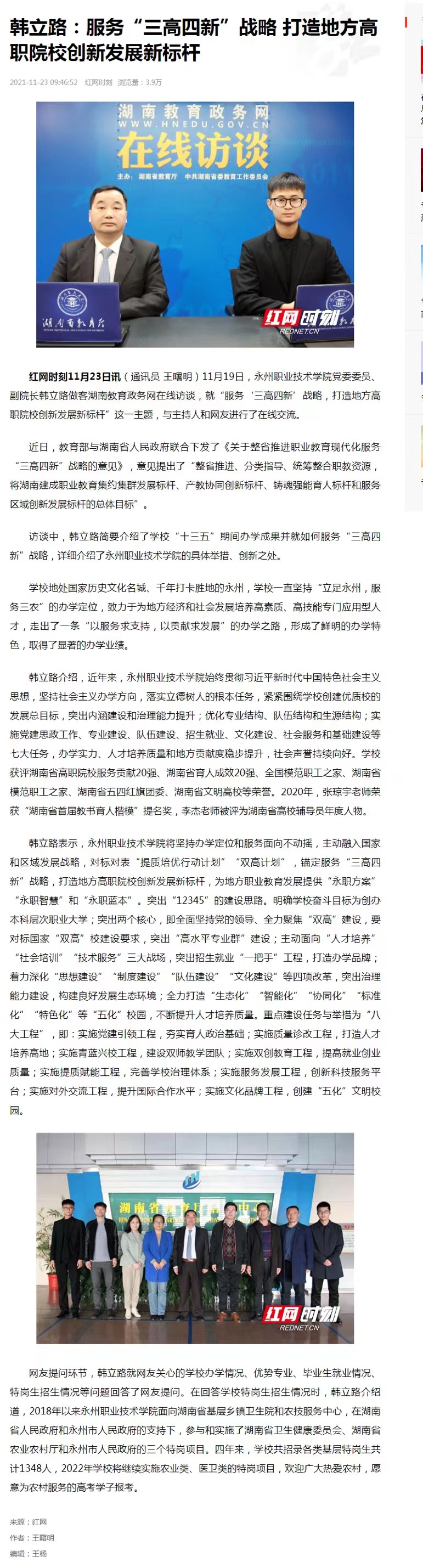 红网时刻11月23日讯(通讯员 王曙明)11月19日,永州职业技术学院党委委员、副院长韩立路做客湖南教育政务网在线访谈,就“服务‘三高四新’战略,打造地方高职院校创新发展新标杆”这一主题,与主持人和网友进行了在线交流。近日,教育部与湖南省人民政府联合下发了《关于整省推进职业教育现代化服务“三高四新”战略的意见》,意见提出了“整省推进、分类指导、统筹整合职教资源,将湖南建成职业教育集约集群发展标杆、产教协同创新标杆、铸魂强能育人标杆和服务区域创新发展标杆的总体目标”。访谈中,韩立路简要介绍了学校“十三五”期间办学成果并就如何服务“三高四新”战略,详细介绍了永州职业技术学院的具体举措、创新之处。学校地处国家历史文化名城、千年打卡胜地的永州,学校一直坚持“立足永州,服务三农”的办学定位,致力于为地方经济和社会发展培养高素质、高技能专门应用型人才,走出了一条“以服务求支持,以贡献求发展”的办学之路,形成了鲜明的办学特色,取得了显著的办学业绩。韩立路介绍,近年来,永州职业技术学院始终贯彻习近平新时代中国特色社会主义思想,坚持社会主义办学方向,落实立德树人的根本任务,紧紧围绕学校创建优质校的发展总目标,突出内涵建设和治理能力提升;优化专业结构、队伍结构和生源结构;实施党建思政工作、专业建设、队伍建设、招生就业、文化建设、社会服务和基础建设等七大任务,办学实力、人才培养质量和地方贡献度稳步提升,社会声誉持续向好。学校获评湖南省高职院校服务贡献20强、湖南省育人成效20强、全国模范职工之家、湖南省模范职工之家、湖南省五四红旗团委、湖南省文明高校等荣誉。2020年,张琼宇老师荣获“湖南省首届教书育人楷模”提名奖,李杰老师被评为湖南省高校辅导员年度人物。韩立路表示,永州职业技术学院将坚持办学定位和服务面向不动摇,主动融入国家和区域发展战略,对标对表“提质培优行动计划”“双高计划”,锚定服务“三高四新”战略,打造地方高职院校创新发展新标杆,为地方职业教育发展提供“永职方案”“永职智慧”和“永职蓝本”。突出“12345”的建设思路。明确学校奋斗目标为创办本科层次职业大学;突出两个核心,即全面坚持党的领导、全力聚焦“双高”建设,要对标国家“双高”校建设要求,突出“高水平专业群”建设;主动面向“人才培养”“社会培训”“技术服务”三大战场,突出招生就业“一把手”工程,打造办学品牌;着力深化“思想建设”“制度建设”“队伍建设”“文化建设”等四项改革,突出治理能力建设,构建良好发展生态环境;全力打造“生态化”“智能化”“协同化”“标准化”“特色化”等“五化”校园,不断提升人才培养质量。重点建设任务与举措为“八大工程”,即:实施党建引领工程,夯实育人政治基础;实施质量诊改工程,打造人才培养高地;实施青蓝兴校工程,建设双师教学团队;实施双创教育工程,提高就业创业质量;实施提质赋能工程,完善学校治理体系;实施服务发展工程,创新科技服务平台;实施对外交流工程,提升国际合作水平;实施文化品牌工程,创建“五化”文明校园。网友提问环节,韩立路就网友关心的学校办学情况、优势专业、毕业生就业情况、特岗生招生情况等问题回答了网友提问。在回答学校特岗生招生情况时,韩立路介绍道,2018年以来永州职业技术学院面向湖南省基层乡镇卫生院和农技服务中心,在湖南省人民政府和永州市人民政府的支持下,参与和实施了湖南省卫生健康委员会、湖南省农业农村厅和永州市人民政府的三个特岗项目。四年来,学校共招录各类基层特岗生共计1348人,2022年学校将继续实施农业类、医卫类的特岗项目,欢迎广大热爱农村,愿意为农村服务的高考学子报考。