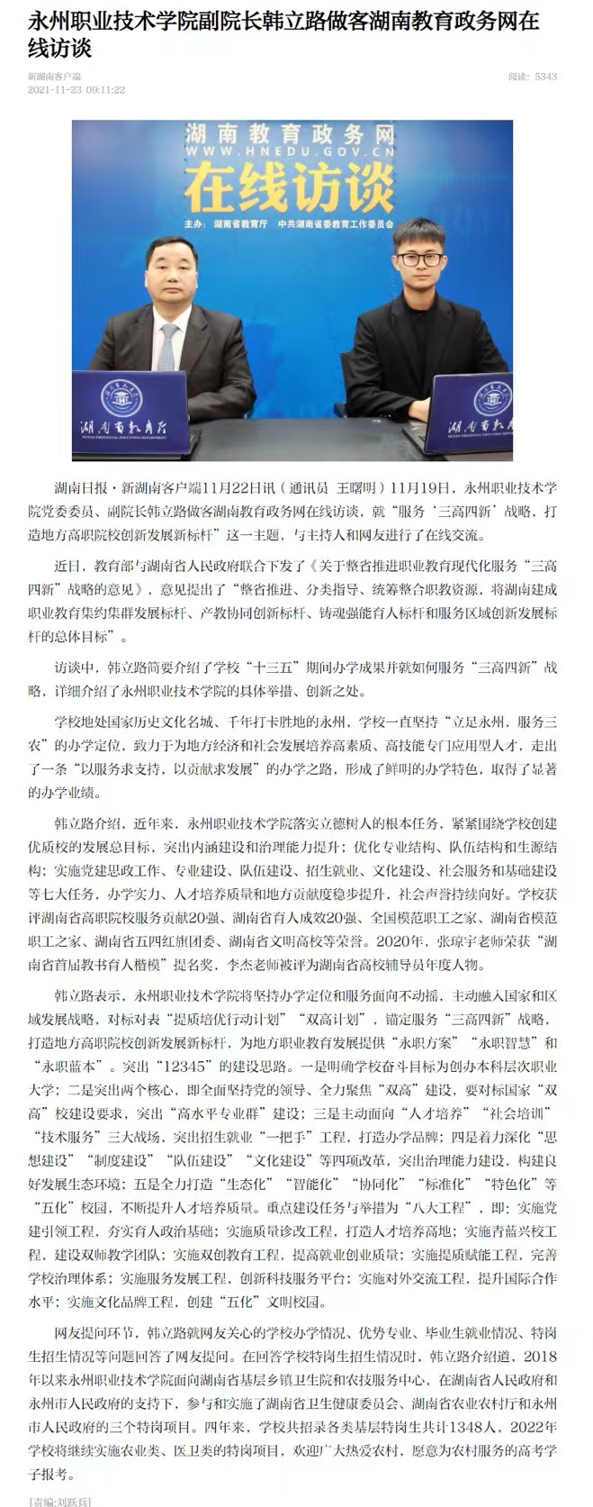 湖南日报·新湖南客户端11月22日讯(通讯员 王曙明)11月19日,永州职业技术学院党委委员、副院长韩立路做客湖南教育政务网在线访谈,就“服务‘三高四新’战略,打造地方高职院校创新发展新标杆”这一主题,与主持人和网友进行了在线交流。近日,教育部与湖南省人民政府联合下发了《关于整省推进职业教育现代化服务“三高四新”战略的意见》,意见提出了“整省推进、分类指导、统筹整合职教资源,将湖南建成职业教育集约集群发展标杆、产教协同创新标杆、铸魂强能育人标杆和服务区域创新发展标杆的总体目标”。访谈中,韩立路简要介绍了学校“十三五”期间办学成果并就如何服务“三高四新”战略,详细介绍了永州职业技术学院的具体举措、创新之处。学校地处国家历史文化名城、千年打卡胜地的永州,学校一直坚持“立足永州,服务三农”的办学定位,致力于为地方经济和社会发展培养高素质、高技能专门应用型人才,走出了一条“以服务求支持,以贡献求发展”的办学之路,形成了鲜明的办学特色,取得了显著的办学业绩。韩立路介绍,近年来,永州职业技术学院落实立德树人的根本任务,紧紧围绕学校创建优质校的发展总目标,突出内涵建设和治理能力提升;优化专业结构、队伍结构和生源结构;实施党建思政工作、专业建设、队伍建设、招生就业、文化建设、社会服务和基础建设等七大任务,办学实力、人才培养质量和地方贡献度稳步提升,社会声誉持续向好。学校获评湖南省高职院校服务贡献20强、湖南省育人成效20强、全国模范职工之家、湖南省模范职工之家、湖南省五四红旗团委、湖南省文明高校等荣誉。2020年,张琼宇老师荣获“湖南省首届教书育人楷模”提名奖,李杰老师被评为湖南省高校辅导员年度人物。韩立路表示,永州职业技术学院将坚持办学定位和服务面向不动摇,主动融入国家和区域发展战略,对标对表“提质培优行动计划”“双高计划”,锚定服务“三高四新”战略,打造地方高职院校创新发展新标杆,为地方职业教育发展提供“永职方案”“永职智慧”和“永职蓝本”。突出“12345”的建设思路。一是明确学校奋斗目标为创办本科层次职业大学;二是突出两个核心,即全面坚持党的领导、全力聚焦“双高”建设,要对标国家“双高”校建设要求,突出“高水平专业群”建设;三是主动面向“人才培养”“社会培训”“技术服务”三大战场,突出招生就业“一把手”工程,打造办学品牌;四是着力深化“思想建设”“制度建设”“队伍建设”“文化建设”等四项改革,突出治理能力建设,构建良好发展生态环境;五是全力打造“生态化”“智能化”“协同化”“标准化”“特色化”等“五化”校园,不断提升人才培养质量。重点建设任务与举措为“八大工程”,即:实施党建引领工程,夯实育人政治基础;实施质量诊改工程,打造人才培养高地;实施青蓝兴校工程,建设双师教学团队;实施双创教育工程,提高就业创业质量;实施提质赋能工程,完善学校治理体系;实施服务发展工程,创新科技服务平台;实施对外交流工程,提升国际合作水平;实施文化品牌工程,创建“五化”文明校园。网友提问环节,韩立路就网友关心的学校办学情况、优势专业、毕业生就业情况、特岗生招生情况等问题回答了网友提问。在回答学校特岗生招生情况时,韩立路介绍道,2018年以来永州职业技术学院面向湖南省基层乡镇卫生院和农技服务中心,在湖南省人民政府和永州市人民政府的支持下,参与和实施了湖南省卫生健康委员会、湖南省农业农村厅和永州市人民政府的三个特岗项目。四年来,学校共招录各类基层特岗生共计1348人,2022年学校将继续实施农业类、医卫类的特岗项目,欢迎广大热爱农村,愿意为农村服务的高考学子报考。[责编:刘跃兵]