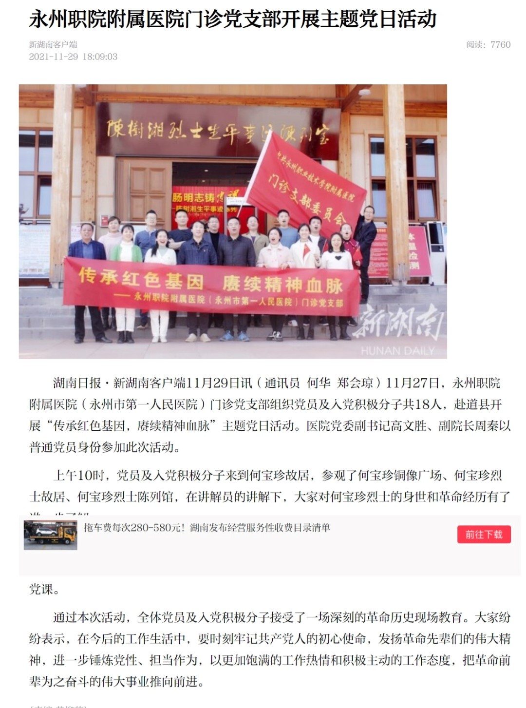湖南日报·新湖南客户端11月29日讯(通讯员 何华 郑会琼)11月27日,永州职院附属医院(永州市第一人民医院)门诊党支部组织党员及入党积极分子共18人,赴道县开展“传承红色基因,赓续精神血脉”主题党日活动。医院党委副书记高文胜、副院长周秦以普通党员身份参加此次活动。上午10时,党员及入党积极分子来到何宝珍故居,参观了何宝珍铜像广场、何宝珍烈士故居、何宝珍烈士陈列馆,在讲解员的讲解下,大家对何宝珍烈士的身世和革命经历有了进一步了解。随后大家来到陈树湘烈士纪念馆前,面对着鲜红的党旗,重温了入党誓词。随后到陈树湘烈士纪念馆内参观学习了湘江战役的惨烈革命历史。副院长周秦为大家上了一堂生动的微党课。通过本次活动,全体党员及入党积极分子接受了一场深刻的革命历史现场教育。大家纷纷表示,在今后的工作生活中,要时刻牢记共产党人的初心使命,发扬革命先辈们的伟大精神,进一步锤炼党性、担当作为,以更加饱满的工作热情和积极主动的工作态度,把革命前辈为之奋斗的伟大事业推向前进。[责编:黄柳英]