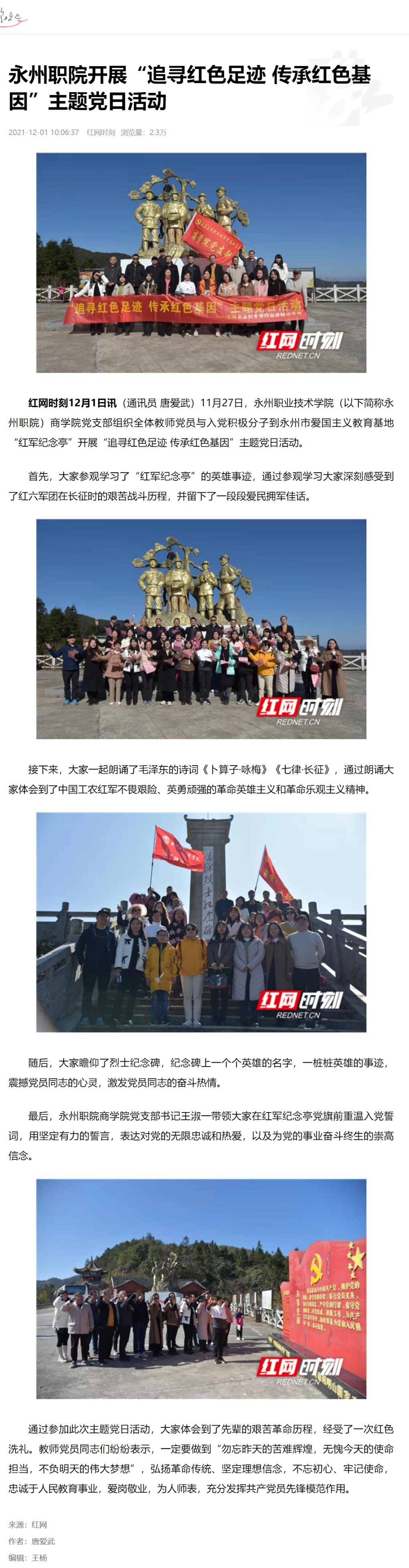 红网时刻12月1日讯(通讯员 唐爱武)11月27日,永州职业技术学院(以下简称永州职院)商学院党支部组织全体教师党员与入党积极分子到永州市爱国主义教育基地“红军纪念亭”开展“追寻红色足迹 传承红色基因”主题党日活动。首先,大家参观学习了“红军纪念亭”的英雄事迹,通过参观学习大家深刻感受到了红六军团在长征时的艰苦战斗历程,并留下了一段段爱民拥军佳话。接下来,大家一起朗诵了毛泽东的诗词《卜算子·咏梅》《七律·长征》,通过朗诵大家体会到了中国工农红军不畏艰险、英勇顽强的革命英雄主义和革命乐观主义精神。随后,大家瞻仰了烈士纪念碑,纪念碑上一个个英雄的名字,一桩桩英雄的事迹,震撼党员同志的心灵,激发党员同志的奋斗热情。最后,永州职院商学院党支部书记王淑一带领大家在红军纪念亭党旗前重温入党誓词,用坚定有力的誓言,表达对党的无限忠诚和热爱,以及为党的事业奋斗终生的崇高信念。通过参加此次主题党日活动,大家体会到了先辈的艰苦革命历程,经受了一次红色洗礼。教师党员同志们纷纷表示,一定要做到“勿忘昨天的苦难辉煌,无愧今天的使命担当,不负明天的伟大梦想”,弘扬革命传统、坚定理想信念,不忘初心、牢记使命,忠诚于人民教育事业,爱岗敬业,为人师表,充分发挥共产党员先锋模范作用。来源:红网作者:唐爱武编辑:王杨
