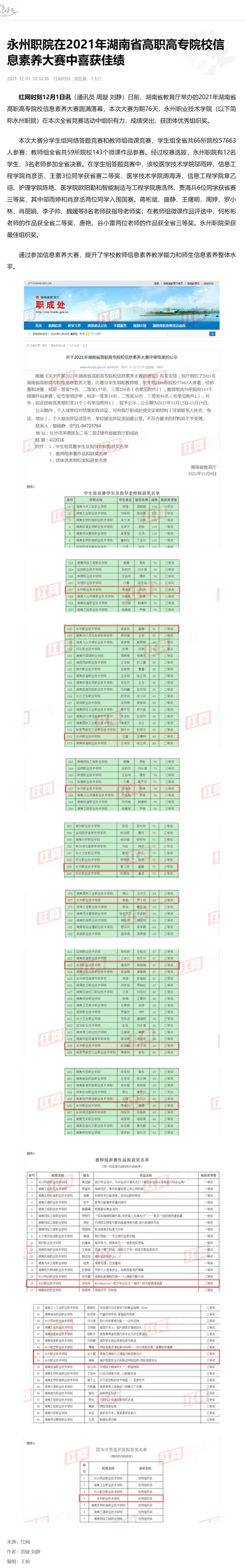 红网时刻12月1日讯(通讯员 周璇 刘静)日前,湖南省教育厅举办的2021年湖南省高职高专院校信息素养大赛圆满落幕,本次大赛为期76天,永州职业技术学院(以下简称永州职院)在本次全省竞赛活动中组织有力,成绩突出,获团体优秀组织奖。本次大赛分学生组网络答题竞赛和教师组微课竞赛,学生组全省共66所院校57663人参赛;教师组全省共59所院校143个微课作品参赛。经过校赛选拔,永州职院有12名学生、3名老师参加全省决赛。在学生组答题竞赛中,该校医学技术学院邬雨婷,信息工程学院肖彦丞、王蕾3位同学获省赛二等奖,医学技术学院周海涛、信息工程学院章乙翊、护理学院陈艳、医学院欧阳勤和智能制造与工程学院唐浩然、贾海兵6位同学获省赛三等奖,其中邬雨婷和肖彦丞两位同学入围国赛。蒋彬斌、盛静、王曙明、周婷、罗小林、肖丽娟、李子帅、魏媛等8名老师获指导老师奖;在教师组微课作品评选中,何彬彬老师的作品获全省二等奖,唐艳、谷小雷两位老师的作品获全省三等奖。永州职院荣获最佳组织奖。通过参加信息素养大赛,提升了学校教师信息素养教学能力和师生信息素养整体水平。来源:红网作者:周璇 刘静编辑:王杨