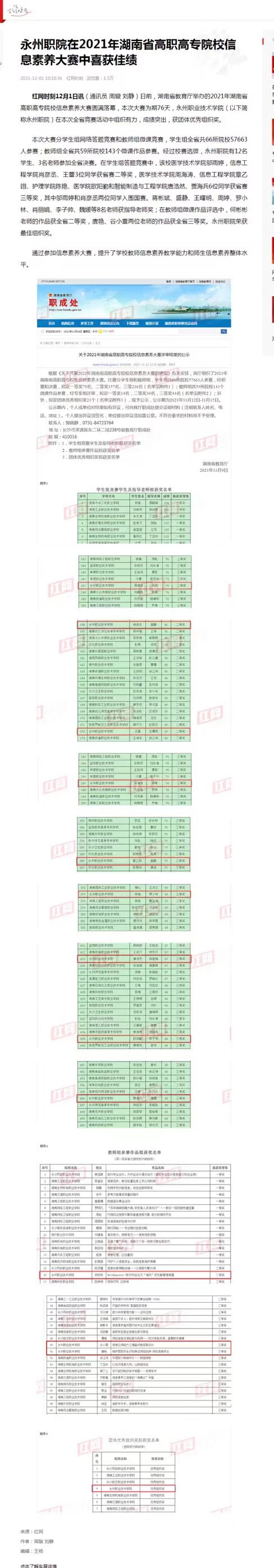 红网时刻12月1日讯(通讯员 周璇 刘静)日前,湖南省教育厅举办的2021年湖南省高职高专院校信息素养大赛圆满落幕,本次大赛为期76天,永州职业技术学院(以下简称永州职院)在本次全省竞赛活动中组织有力,成绩突出,获团体优秀组织奖。本次大赛分学生组网络答题竞赛和教师组微课竞赛,学生组全省共66所院校57663人参赛;教师组全省共59所院校143个微课作品参赛。经过校赛选拔,永州职院有12名学生、3名老师参加全省决赛。在学生组答题竞赛中,该校医学技术学院邬雨婷,信息工程学院肖彦丞、王蕾3位同学获省赛二等奖,医学技术学院周海涛、信息工程学院章乙翊、护理学院陈艳、医学院欧阳勤和智能制造与工程学院唐浩然、贾海兵6位同学获省赛三等奖,其中邬雨婷和肖彦丞两位同学入围国赛。蒋彬斌、盛静、王曙明、周婷、罗小林、肖丽娟、李子帅、魏媛等8名老师获指导老师奖;在教师组微课作品评选中,何彬彬老师的作品获全省二等奖,唐艳、谷小雷两位老师的作品获全省三等奖。永州职院荣获最佳组织奖。 通过参加信息素养大赛,提升了学校教师信息素养教学能力和师生信息素养整体水平。来源:红网作者:周璇 刘静编辑:王杨