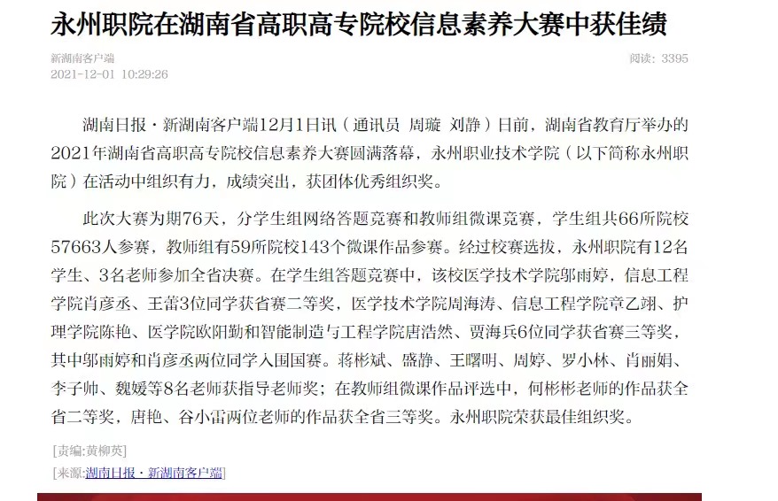 湖南日报·新湖南客户端12月1日讯(通讯员 周璇 刘静)日前,湖南省教育厅举办的2021年湖南省高职高专院校信息素养大赛圆满落幕,永州职业技术学院(以下简称永州职院)在活动中组织有力,成绩突出,获团体优秀组织奖。此次大赛为期76天,分学生组网络答题竞赛和教师组微课竞赛,学生组共66所院校57663人参赛,教师组有59所院校143个微课作品参赛。经过校赛选拔,永州职院有12名学生、3名老师参加全省决赛。在学生组答题竞赛中,该校医学技术学院邬雨婷,信息工程学院肖彦丞、王蕾3位同学获省赛二等奖,医学技术学院周海涛、信息工程学院章乙翊、护理学院陈艳、医学院欧阳勤和智能制造与工程学院唐浩然、贾海兵6位同学获省赛三等奖,其中邬雨婷和肖彦丞两位同学入围国赛。蒋彬斌、盛静、王曙明、周婷、罗小林、肖丽娟、李子帅、魏媛等8名老师获指导老师奖;在教师组微课作品评选中,何彬彬老师的作品获全省二等奖,唐艳、谷小雷两位老师的作品获全省三等奖。永州职院荣获最佳组织奖。[责编:黄柳英][来源:湖南日报·新湖南客户端]