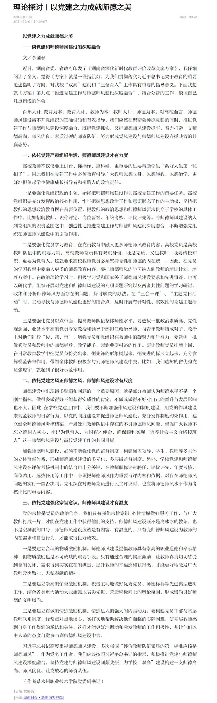 以党建之力成就师德之美——谈党建和师德师风建设的深度融合文/李国春 近日,湖南省委、省政府印发了《湖南省深化新时代教育评价改革实施方案》,我仔细阅读了全文,觉得《方案》就是一盏指航灯,为我们贯彻落实习近平总书记关于教育的重要论述指明了方向,对我校“双高”建设和“三全育人”工作具有重要的指导意义。下面我想就《方案》第九点“推进党建工作与师德师风建设深度融合”,结合分管的工作,谈谈自己几点粗浅的体会。百年大计,教育为本;教育大计,教师为本;教师大计,师德为本。对高校而言,师德师风建设离不开党组织的正确引领和有效指导,我们应该在聚精会神抓党建的同时,推进党建工作与师德师风建设深度融合,既把党建抓实,又把师德师风建设抓牢,着力打造一支师德高尚、师风优良、素质过硬的师资队伍,努力形成党风建设与师德师风建设齐抓共管的共赢态势。一、依托党建严肃组织生活,师德师风建设才有力度高校教师不仅仅要上讲台、懂操作、搞科研,更重要的是要帮助学生“系好人生第一粒扣子”。因此我们在党建工作中必须教育引导广大教师以德立身、以德施教、以德治学,更好地担负起学生健康成长指导者和引路人的政治责任。一是要强化党组织政治引领,始终把师德师风建设作为高校党建工作的首要任务。高校党组织要充分发挥政治核心作用,牢牢把握思想政治工作和意识形态工作的主动权,坚持把教师的思想政治教育摆在首要位置,把教师的政治思想和师德师风要求贯穿于学校的具体工作中,比如招聘教师、职称评定、岗位晋级、年终考核、评优评先等。将师德师风建设纳入到党组织的职责范围之中,创造性地推进党建工作与师德师风建设深度融合,不断增强党组织在师德师风建设中的引领作用。二是要强化党员学习教育,在党员教育中融入更多师德师风教育内容。高校党员是高校教师队伍中的重要力量。高校教师党员具有双重身份,既是党员,又是教师;既要传授知识,更要为党育人。这就要求高校教师党员必须坚持党性和师德的内在统一,因此,在党员的学习教育中要融入更多的师德教育内容,要把师德师风的学习纳入到教师的培训计划、培养方案中。在政治理论学习时,积极学习党和国家关于师德师风建设要求和先进事迹,也可以研代学,组织开展对党建和师德师风建设的专项课题研究以及两者共性问题的学习研讨,收集和分析师德师风方面存在的问题,探讨解决的办法。在“三会一课”、“主题党日活动”时,主动寻找与师德师风建设更好的结合点,及时开展有针对性、实效性的党建主题活动。三是要强化党员以点带面,提高教师队伍整体师德水平。要选拔一批政治素质高、党性观念强、业务水平高的党员专家教授和领导干部担任政治导师,与青年教师结成对子,政治上对他们进行“传、帮、带”,增强党员和党组织在教师中的凝聚力和号召力。要选树一批优秀党员和教师中的师德标兵、教学能手,起到典型引路的作用。要让教师党员挂牌上岗,在日常教育教学中把党员身份亮出来,把先锋的形象树起来,把先进的标尺立起来,充分发挥模范表率作用,带领全体教师积极参与到师德师风建设中去。比如,我们选树的省优秀党员张琼宇,就起到了很好示范作用。二、依托党建之风正师德之风,师德师风建设才有尺度师德建设中出现诸多弊端和问题的一个重要原因,就是部分教师认为师德水平不是一个刚性指标,做得多做得好不能获得实质性的肯定,不做或做得不好对自己的晋升与发展影响也不大。因此,在学校党建工作中,我们要不断加强作风建设和制度建设,用党的作风建设来规范教师的日常行为,以党的制度建设来促进师德师风建设。充分发挥制度约束作用,建立健全师德师风考核档案,严肃处理教师队伍中存在的不良师德师风问题,督促广大教师不忘立德树人初心,牢记为党育人、为国育才使命,确保顺利实现“培养社会主义合格接班人”这一师德师风建设与高校党建工作的共同目标。加强师德师风建设,必须不断强化党的监督制度,构建涵盖领导、学生、教师等多主体的立体监督体系,形成师德师风建设的多元化、多层级监督制度。另外,学校党建和师德师风建设在评价考核机制中的结合也十分关键,在教师职称评审聘任、评优评先、年度考核、岗位聘用、选拔任用等工作中,必须把师德师风作为重要考评内容和依据,对存在师德师风问题的实行一票否决制。党组织在对教师党员进行民主评议时,也应将师德师风水平作为考核评比的重要内容。三、依托党建强化宗旨意识,师德师风建设才有温度党的宗旨是党员的政治信条。我们只有强化宗旨意识,心甘情愿做好服务工作,与广大教师打成一片,才能在党建工作中获得他们的支持。师德师风建设既不是冷冰冰的教条,也不是空洞洞的口号,师德师风建设应该是有内容、有温度的,只有变师德师风建设为教师的内在需求和自觉行为,才能取得良好成效。一是要建立合理的物质激励机制。师德师风建设提倡教师具有崇高的职业道德和奉献精神,但物质激励也是不可或缺的重要手段。只有通过合理的物质激励,让教师真真切切感受到党的关怀,需求得到实实在在的满足,提升教师的幸福感和获得感,才能更好地激发广大教师爱岗敬业、无私奉献的精神。二是要建立