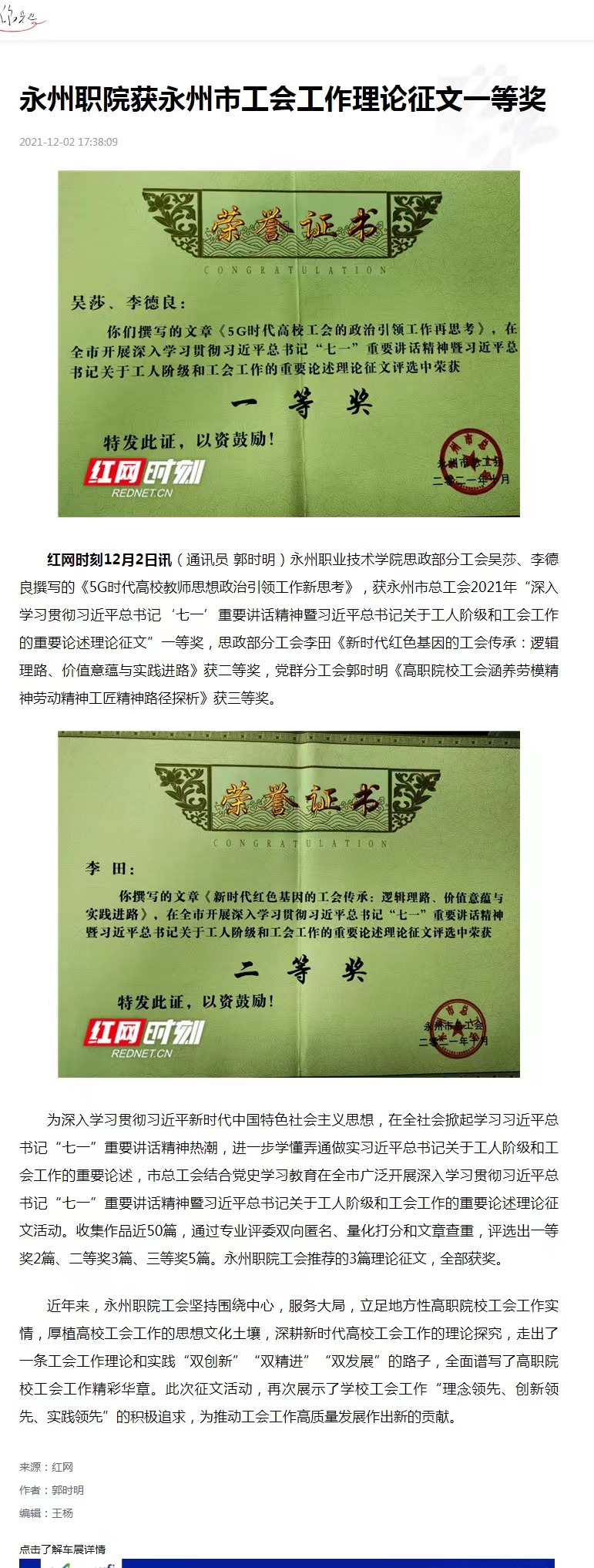 红网时刻12月2日讯(通讯员 郭时明)永州职业技术学院思政部分工会吴莎、李德良撰写的《5G时代高校教师思想政治引领工作新思考》,获永州市总工会2021年“深入学习贯彻习近平总书记‘七一’重要讲话精神暨习近平总书记关于工人阶级和工会工作的重要论述理论征文”一等奖,思政部分工会李田《新时代红色基因的工会传承:逻辑理路、价值意蕴与实践进路》获二等奖,党群分工会郭时明《高职院校工会涵养劳模精神劳动精神工匠精神路径探析》获三等奖。为深入学习贯彻习近平新时代中国特色社会主义思想,在全社会掀起学习习近平总书记“七一”重要讲话精神热潮,进一步学懂弄通做实习近平总书记关于工人阶级和工会工作的重要论述,市总工会结合党史学习教育在全市广泛开展深入学习贯彻习近平总书记“七一”重要讲话精神暨习近平总书记关于工人阶级和工会工作的重要论述理论征文活动。收集作品近50篇,通过专业评委双向匿名、量化打分和文章查重,评选出一等奖2篇、二等奖3篇、三等奖5篇。永州职院工会推荐的3篇理论征文,全部获奖。近年来,永州职院工会坚持围绕中心,服务大局,立足地方性高职院校工会工作实情,厚植高校工会工作的思想文化土壤,深耕新时代高校工会工作的理论探究,走出了一条工会工作理论和实践“双创新”“双精进”“双发展”的路子,全面谱写了高职院校工会工作精彩华章。此次征文活动,再次展示了学校工会工作“理念领先、创新领先、实践领先”的积极追求,为推动工会工作高质量发展作出新的贡献。来源:红网作者:郭时明编辑:王杨