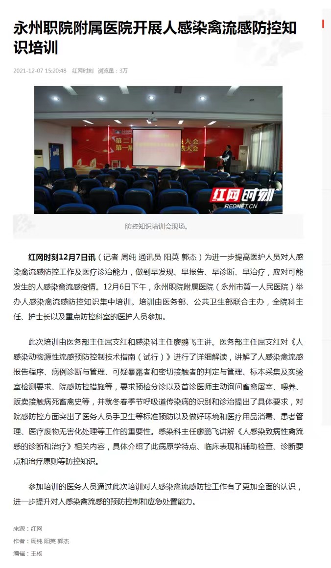 红网时刻12月7日讯(记者 周纯 通讯员 阳英 郭杰)为进一步提高医护人员对人感染禽流感防控工作及医疗诊治能力,做到早发现、早报告、早诊断、早治疗,应对可能发生的人感染禽流感疫情。12月6日下午,永州职院附属医院(永州市第一人民医院)举办人感染禽流感防控知识集中培训。培训由医务部、公共卫生部联合主办,全院科主任、护士长以及重点防控科室的医护人员参加。此次培训由医务部主任屈支红和感染科主任廖鹏飞主讲。医务部主任屈支红对《人感染动物源性流感预防控制技术指南(试行)》进行了详细解读,讲解了人感染禽流感报告程序、病例诊断与管理、可疑暴露者和密切接触者的判定与管理、标本采集及实验室检测要求、院感防控措施等,要求预检分诊以及首诊医师主动询问畜禽屠宰、喂养、贩卖接触病死畜禽史等,并就冬春季节呼吸道传染病的识别和诊治提出了具体要求,对院感防控方面突出了医务人员手卫生等标准预防以及做好环境和医疗用品消毒、患者管理、医疗废物无害化处理等工作的重要性。感染科主任廖鹏飞讲解《人感染致病性禽流感的诊断和治疗》相关内容,具体介绍了此病原学特点、临床表现和辅助检查、诊断要点和治疗原则等防控知识。参加培训的医务人员通过此次培训对人感染禽流感防控工作有了更加全面的认识,进一步提升对人感染禽流感的预防控制和应急处置能力。