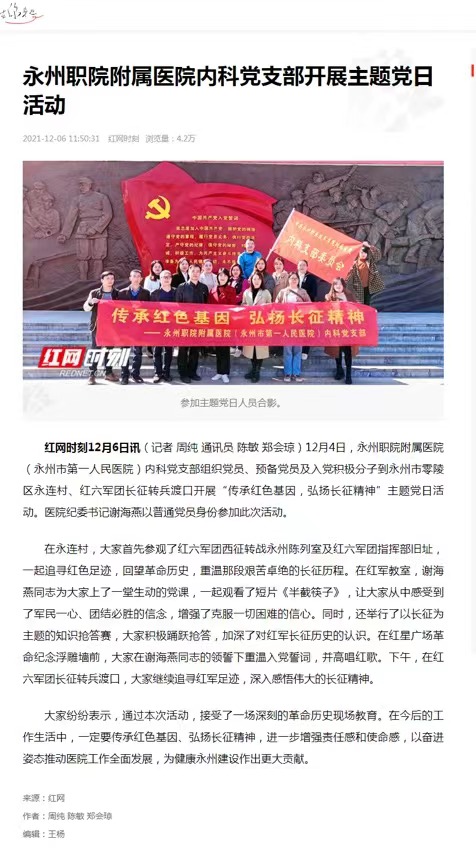 红网时刻12月6日讯(记者 周纯 通讯员 陈敏 郑会琼)12月4日,永州职院附属医院(永州市第一人民医院)内科党支部组织党员、预备党员及入党积极分子到永州市零陵区永连村、红六军团长征转兵渡口开展“传承红色基因,弘扬长征精神”主题党日活动。医院纪委书记谢海燕以普通党员身份参加此次活动。在永连村,大家首先参观了红六军团西征转战永州陈列室及红六军团指挥部旧址,一起追寻红色足迹,回望革命历史,重温那段艰苦卓绝的长征历程。在红军教室,谢海燕同志为大家上了一堂生动的党课,一起观看了短片《半截筷子》,让大家从中感受到了军民一心、团结必胜的信念,增强了克服一切困难的信心。同时,还举行了以长征为主题的知识抢答赛,大家积极踊跃抢答,加深了对红军长征历史的认识。在红星广场革命纪念浮雕墙前,大家在谢海燕同志的领誓下重温入党誓词,并高唱红歌。下午,在红六军团长征转兵渡口,大家继续追寻红军足迹,深入感悟伟大的长征精神。大家纷纷表示,通过本次活动,接受了一场深刻的革命历史现场教育。在今后的工作生活中,一定要传承红色基因、弘扬长征精神,进一步增强责任感和使命感,以奋进姿态推动医院工作全面发展,为健康永州建设作出更大贡献。