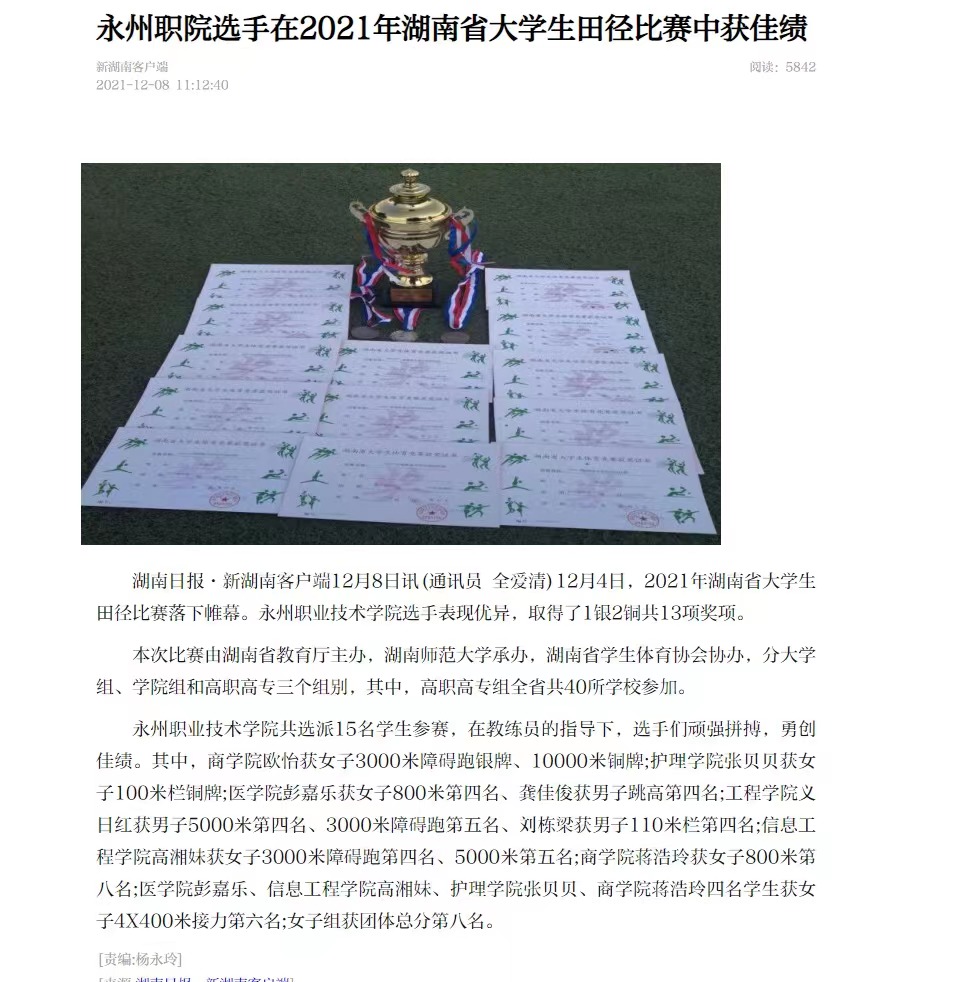 湖南日报·新湖南客户端12月8日讯(通讯员 全爱清)12月4日,2021年湖南省大学生田径比赛落下帷幕。永州职业技术学院选手表现优异,取得了1银2铜共13项奖项。本次比赛由湖南省教育厅主办,湖南师范大学承办,湖南省学生体育协会协办,分大学组、学院组和高职高专三个组别,其中,高职高专组全省共40所学校参加。永州职业技术学院共选派15名学生参赛,在教练员的指导下,选手们顽强拼搏,勇创佳绩。其中,商学院欧怡获女子3000米障碍跑银牌、10000米铜牌;护理学院张贝贝获女子100米栏铜牌;医学院彭嘉乐获女子800米第四名、龚佳俊获男子跳高第四名;工程学院义日红获男子5000米第四名、3000米障碍跑第五名、刘栋梁获男子110米栏第四名;信息工程学院高湘妹获女子3000米障碍跑第四名、5000米第五名;商学院蒋浩玲获女子800米第八名;医学院彭嘉乐、信息工程学院高湘妹、护理学院张贝贝、商学院蒋浩玲四名学生获女子4X400米接力第六名;女子组获团体总分第八名。