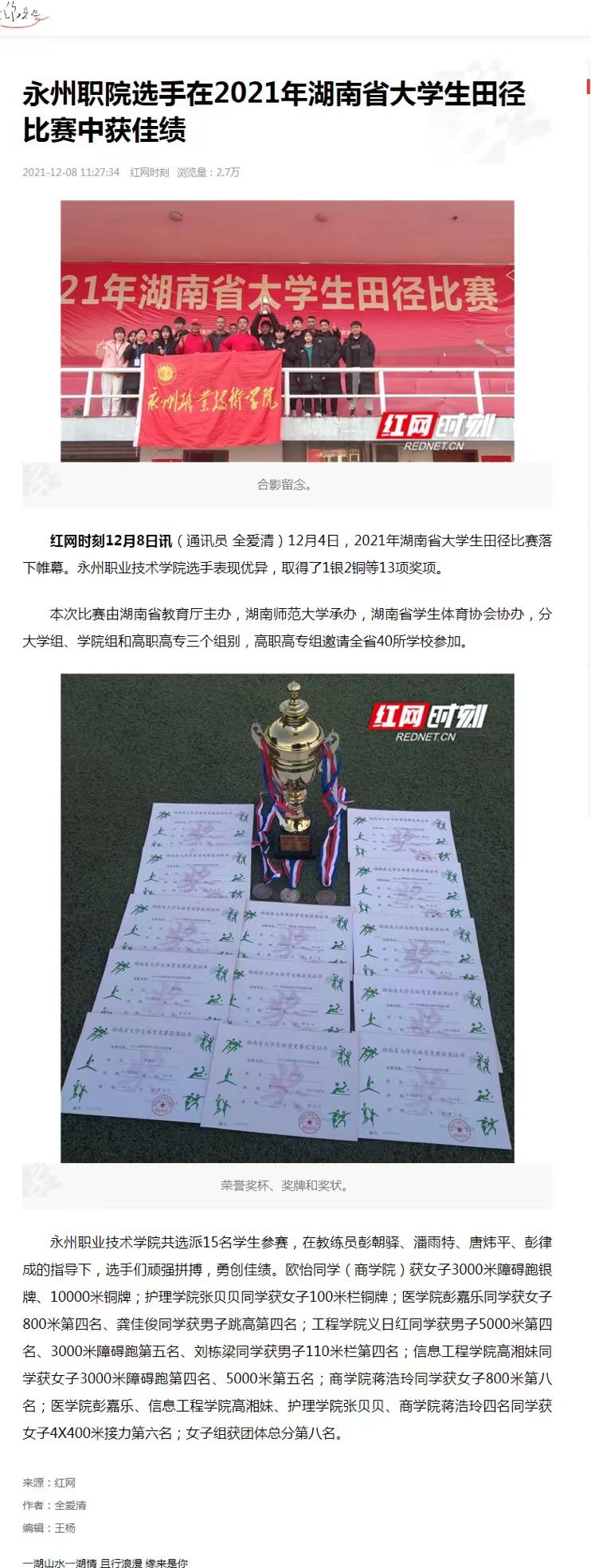 红网时刻12月8日讯(通讯员 全爱清)12月4日,2021年湖南省大学生田径比赛落下帷幕。永州职业技术学院选手表现优异,取得了1银2铜等13项奖项。本次比赛由湖南省教育厅主办,湖南师范大学承办,湖南省学生体育协会协办,分大学组、学院组和高职高专三个组别,高职高专组邀请全省40所学校参加。永州职业技术学院共选派15名学生参赛,在教练员彭朝驿、潘雨特、唐炜平、彭律成的指导下,选手们顽强拼搏,勇创佳绩。欧怡同学(商学院)获女子3000米障碍跑银牌、10000米铜牌;护理学院张贝贝同学获女子100米栏铜牌;医学院彭嘉乐同学获女子800米第四名、龚佳俊同学获男子跳高第四名;工程学院义日红同学获男子5000米第四名、3000米障碍跑第五名、刘栋梁同学获男子110米栏第四名;信息工程学院高湘妹同学获女子3000米障碍跑第四名、5000米第五名;商学院蒋浩玲同学获女子800米第八名;医学院彭嘉乐、信息工程学院高湘妹、护理学院张贝贝、商学院蒋浩玲四名同学获女子4X400米接力第六名;女子组获团体总分第八名。