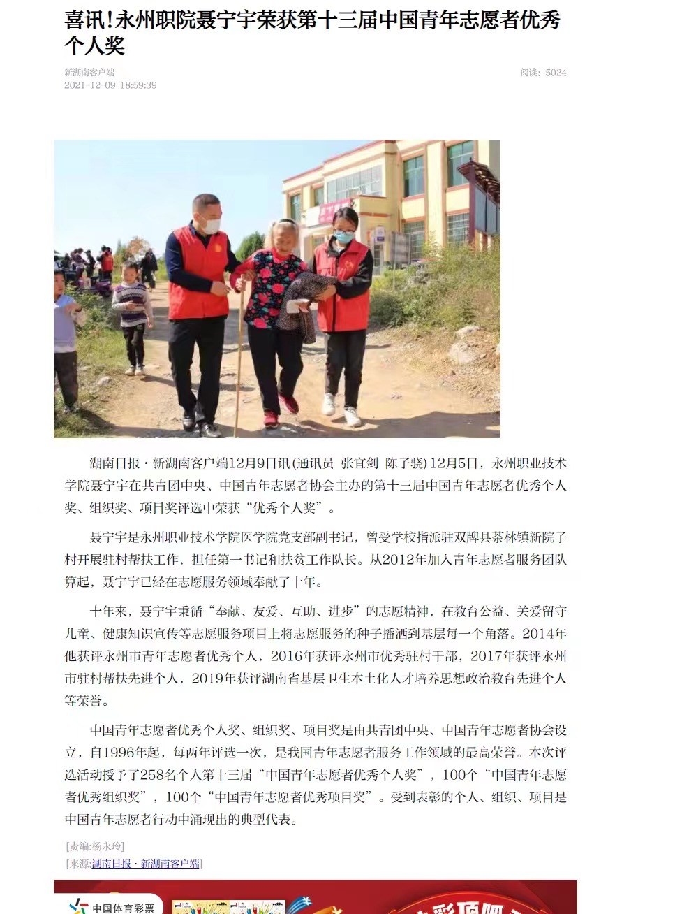 湖南日报·新湖南客户端12月9日讯(通讯员 张宜剑 陈子骁)12月5日,永州职业技术学院聂宁宇在共青团中央、中国青年志愿者协会主办的第十三届中国青年志愿者优秀个人奖、组织奖、项目奖评选中荣获“优秀个人奖”。聂宁宇是永州职业技术学院医学院党支部副书记,曾受学校指派驻双牌县茶林镇新院子村开展驻村帮扶工作,担任第一书记和扶贫工作队长。从2012年加入青年志愿者服务团队算起,聂宁宇已经在志愿服务领域奉献了十年。十年来,聂宁宇秉循“奉献、友爱、互助、进步”的志愿精神,在教育公益、关爱留守儿童、健康知识宣传等志愿服务项目上将志愿服务的种子播洒到基层每一个角落。2014年他获评永州市青年志愿者优秀个人,2016年获评永州市优秀驻村干部,2017年获评永州市驻村帮扶先进个人,2019年获评湖南省基层卫生本土化人才培养思想政治教育先进个人等荣誉。中国青年志愿者优秀个人奖、组织奖、项目奖是由共青团中央、中国青年志愿者协会设立,自1996年起,每两年评选一次,是我国青年志愿者服务工作领域的最高荣誉。本次评选活动授予了258名个人第十三届“中国青年志愿者优秀个人奖”,100个“中国青年志愿者优秀组织奖”,100个“中国青年志愿者优秀项目奖”。受到表彰的个人、组织、项目是中国青年志愿者行动中涌现出的典型代表。