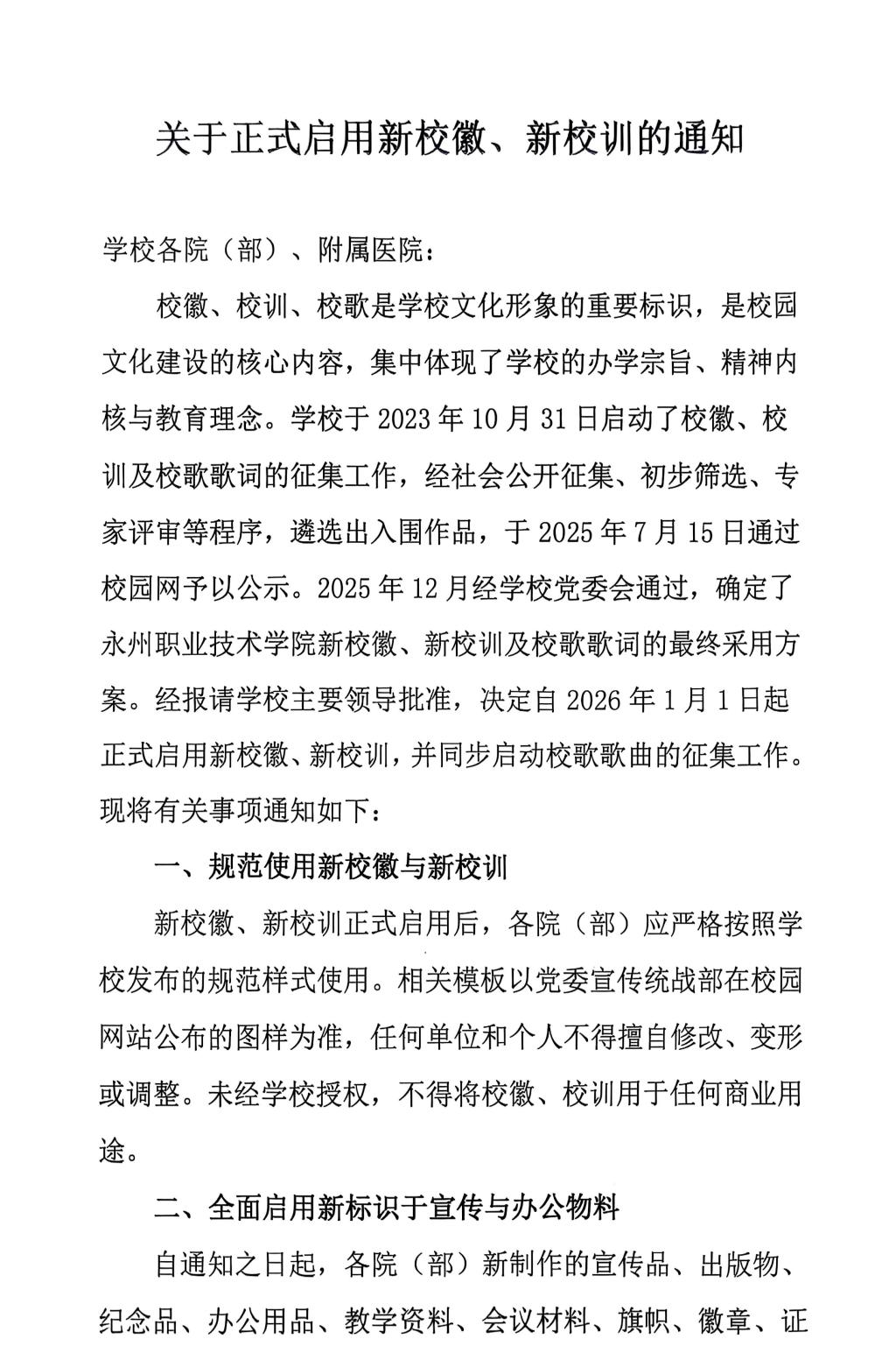 校徽、校训、校歌是学校文化形象的重要标识,是校园文化建设的核心内容,集中体现了学校的办学宗旨、精神内核与教育理念。学校于2023年10月31日启动了校徽、校训及校歌歌词的征集工作,经社会公开征集、初步筛选、专家评审等程序,遴选出入围作品,于2025年7月15日通过校园网予以公示。2025年12月经学校党委会通过,确定了永州职业技术学院新校徽、新校训及校歌歌词的最终采用方案。经报请学校主要领导批准,决定自2026年1月1日起正式启用新校徽、新校训,并同步启动校歌歌曲的征集工作。现将有关事项通知如下:
