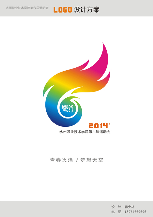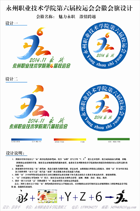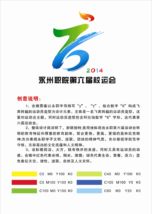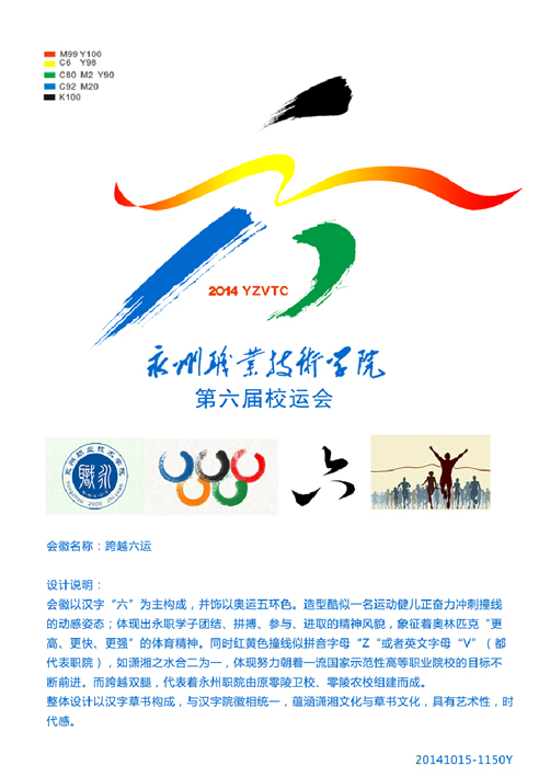 永州职院第六届校运会是全校师生的体育盛会,会旗与会徽是传播和体现运动会文化的重要载体,对于宣扬运动会主题思想有着至关重要的作用。为了保证会旗与会徽的设计质量和效果,校运会组委会于近期面向我院全体师生征集了设计方案。截止10月20号,共收到校内外设计者参赛作品13件。经组委会组织专家评审,共评选出一等奖1件、二等奖2件、三等奖2件共5件获奖作品。其中,一等奖作品为本届校运会采用作品。结果如下: