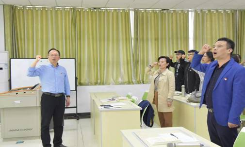 党课结束后,李国春副书记带领商学院全体党员诵读习语金句和重温入党誓词。结束后,全体党员同志表示,要不忘初心跟党走,牢记使命再出发,立足岗位职责,干好本职工作,共创商学院的辉煌。