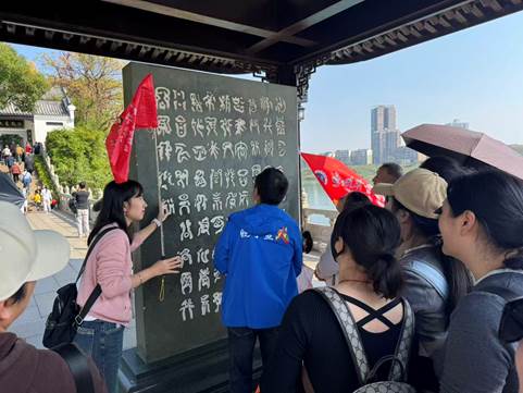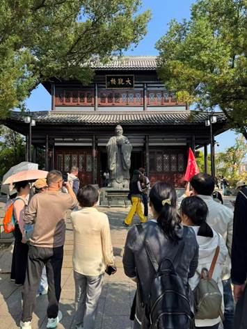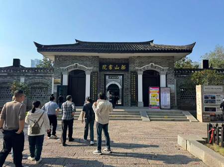 午饭后,队伍来到千年学府——石鼓书院。作为中国四大书院之一,石鼓书院始建于唐代,迄今已有逾1200年历史,宋仁宗曾赐匾额,朱熹、韩愈等名家曾在此讲学游历。书院坐落于衡阳石鼓山,雄踞湘江、蒸水、耒水三江汇流处,风光旖旎,素有“石鼓江山”之美誉。书院内文化底蕴深厚,核心看点包括“三绝”:看似有字却难辨认的石碑、看似有鼓却敲不响的石鼓、看似有书却翻不动的石雕书;主要建筑有山门、武侯祠、李忠节公祠、大观楼(内设“石鼓七贤”雕刻)及合江亭等;摩崖石刻如“西谿”等,更是千年文脉的生动见证。