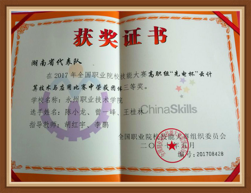 6月7、8日,全国职业院校技能大赛高职组云计算技术与应用赛项在深圳职业技术学院举行。我院计算机系参赛学生陈小龙、曾一峰、王桂林荣获云计算技术与应用项目团体三等奖。