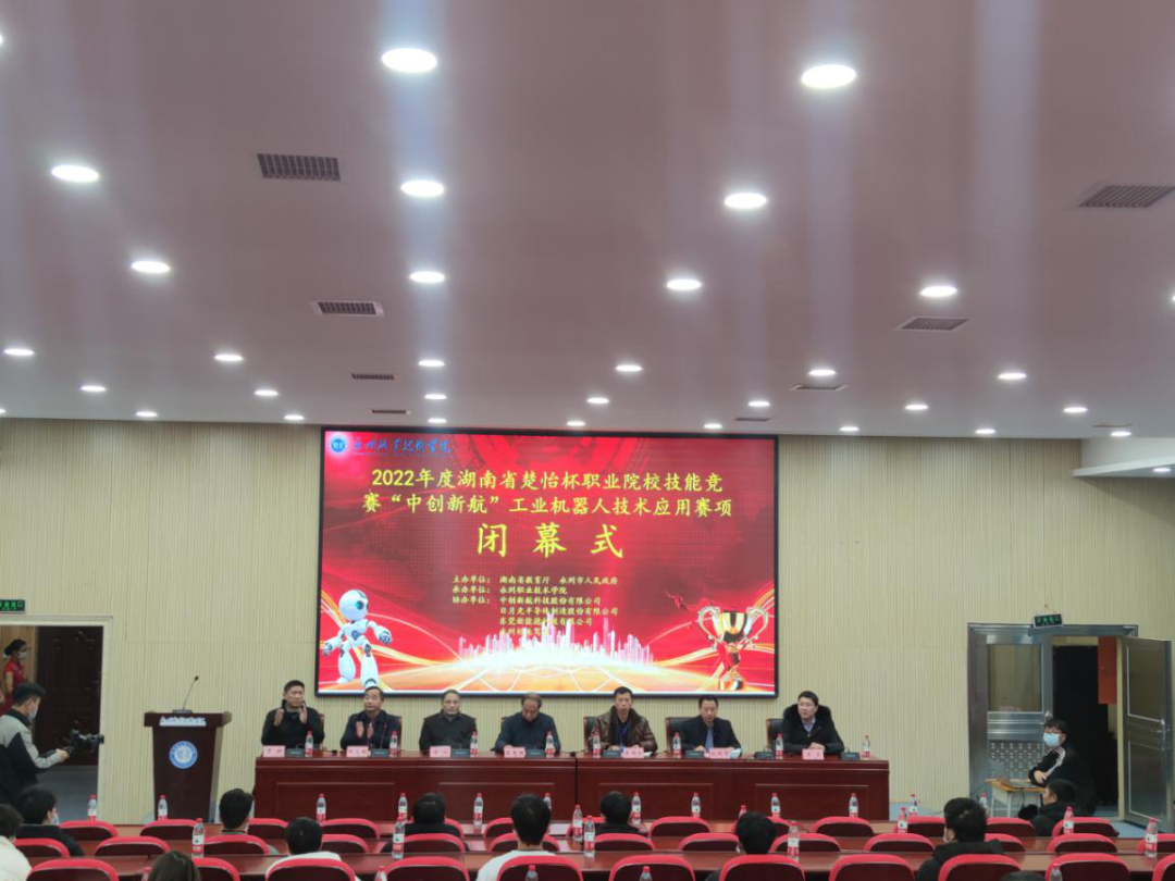 12月28日上午,由湖南省教育厅、永州市人民政府主办,永州职业技术学院承办的2022年度湖南省“楚怡杯”职业院校技能竞赛工业机器人技术应用赛项在永州职业技术学院工程学院报告厅圆满闭幕。永州职院党委副书记、校长翟惠根,省派赛点第一副主任李雄和、省派赛项负责人欧瑞华、工程学院院长罗辉、教务处处长李杰、湖南农业大学康江教授、参赛选手等100余人出席闭幕式,会议由永州职院党委委员、副校长韩立路主持。