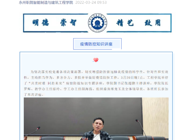 为做好疫情期间学校师生的心理防护和心理危机干预工作,及时防控、管理学生中可能出现的疫情心理危机事件,根据省教育厅及学院疫情防控处置工作领导小组相关要求和学校制定新冠肺炎疫情心理工作方案。我院立即把工作落实到师生每个人,心理辅导老师积极主动深入教室召开《疫情防控学生安全管理》主题班会并做好疫情预防知识的宣讲工作,扎实落实各项政策,确保打好疫情防控保卫战。