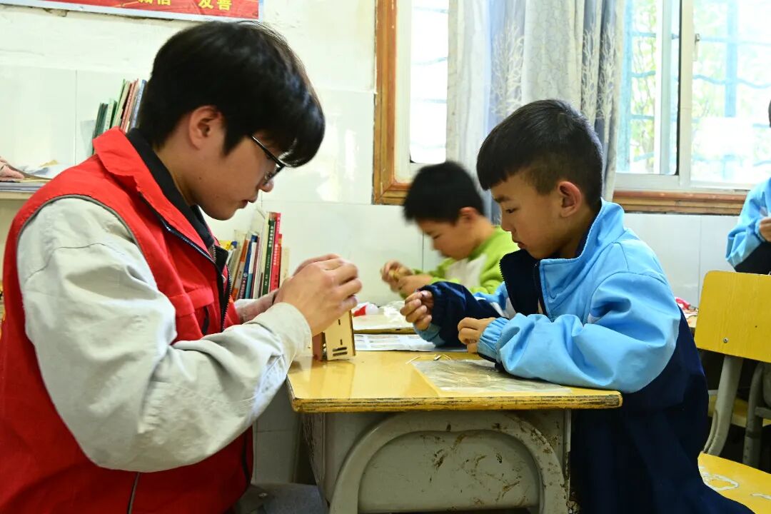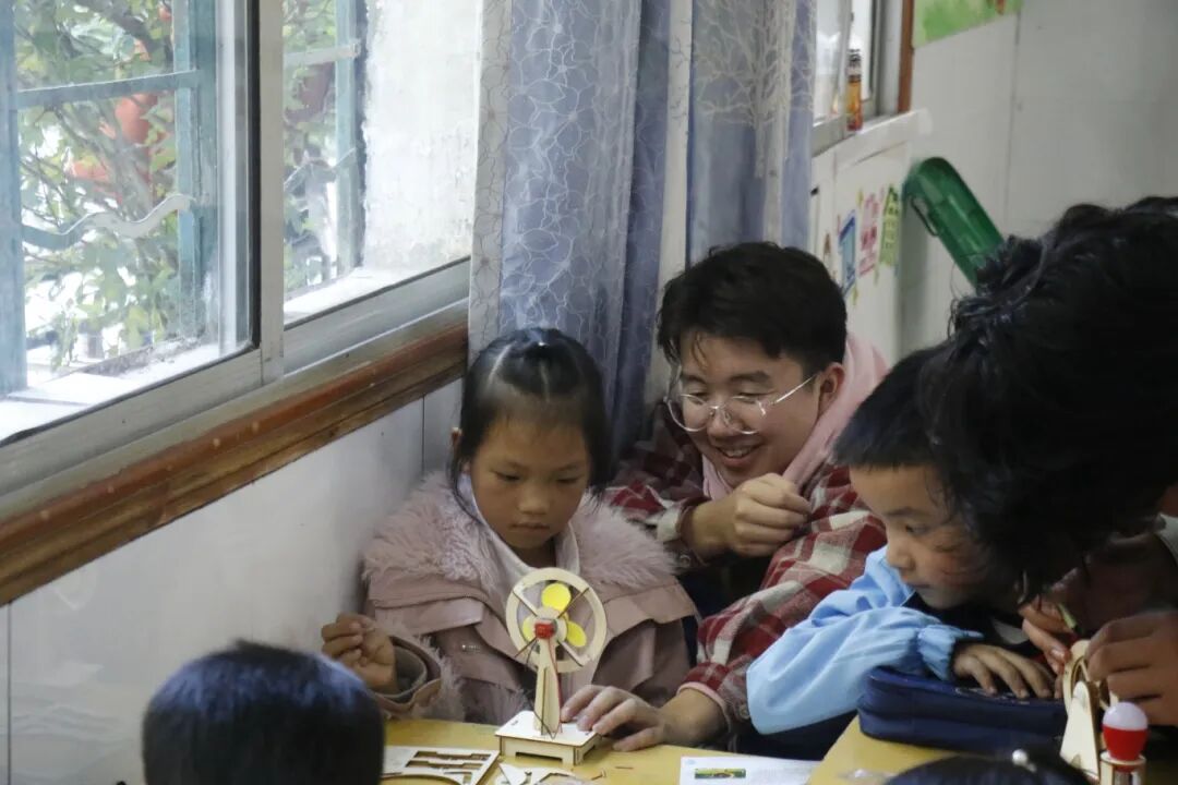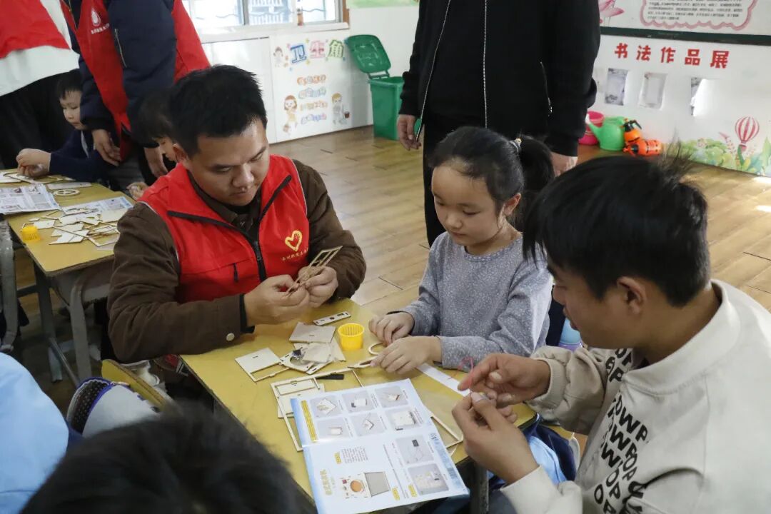 科学课后,志愿者按分组带领孩子们开启科技小制作拼装环节。简易手摇发电机、小型风力发电机、组装空调、洗衣机等适配小学生动手能力的模型,成为孩子们探索实践的 “载体”。志愿者们一对一手把手指导,帮助孩子们识别零件、理清拼装逻辑、纠正操作误区,鼓励大家大胆尝试、自主探索。当一个个亲手组装的模型成功运转时,孩子们的脸上满是成就感,在动手过程中不仅锻炼了逻辑思维与团队协作能力,也近距离感受了工程学科的魅力。