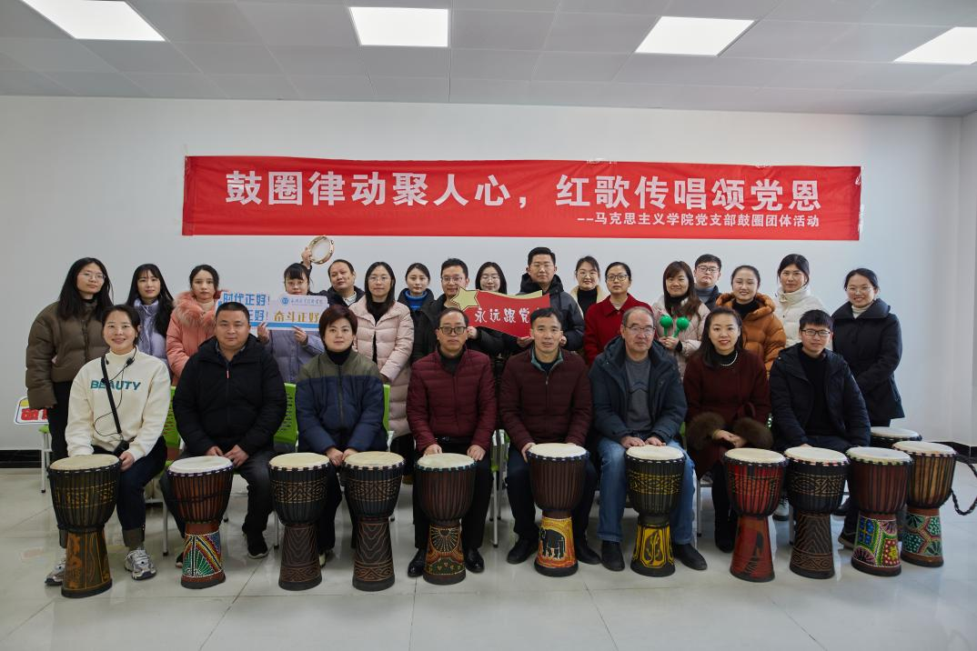1月12日上午,在学校综合楼504的教室内,红歌嘹亮、鼓音铿锵、笑声阵阵,马克思主义学院党支部组织开展了一场以“鼓圈律动聚人心,红歌传唱颂党恩”为主题的主题党日活动。