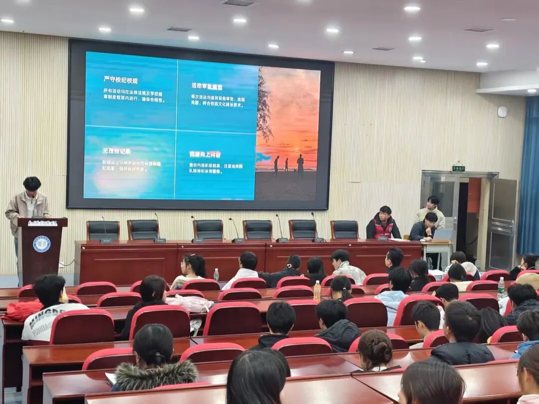 答辩评审工作坚持规范、公正、公开的原则。各社团高度重视,按要求选派1至2名熟悉社团工作的核心成员到场,分别负责陈述答辩与PPT演示。活动现场组织有序,社团代表提前抵达候场区签到并按序就座,在前序社团答辩时,后序社团代表已按要求在候场区静候准备,展现了良好的精神风貌与纪律意识。