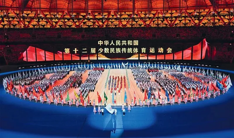 2024年11月22日,中华人民共和国第十二届少数民族传统体育运动会开幕式在海南省三亚市举行,56个民族欢聚一堂,共同奏响中华民族一家亲、同心共筑中国梦的华美乐章。图为开幕式现场。新华社记者 郭程/摄