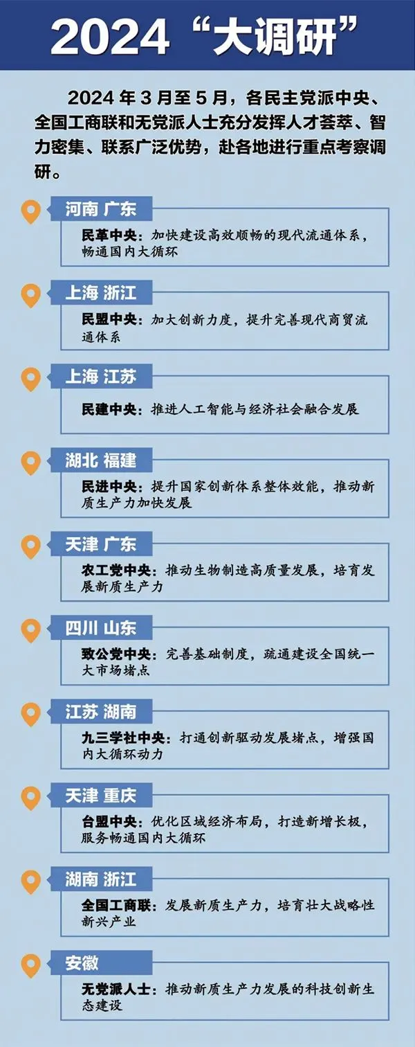 各民主党派中央、全国工商联和无党派人士紧紧围绕党和国家中心工作,积极参政议政、建言献策,为党和国家科学决策、民主决策提供重要参考。图为2024年3月至5月,各民主党派中央、全国工商联和无党派人士聚焦“发展新质生产力”和“畅通国内大循环”分赴各地开展实地调研情况。中央统战部供图