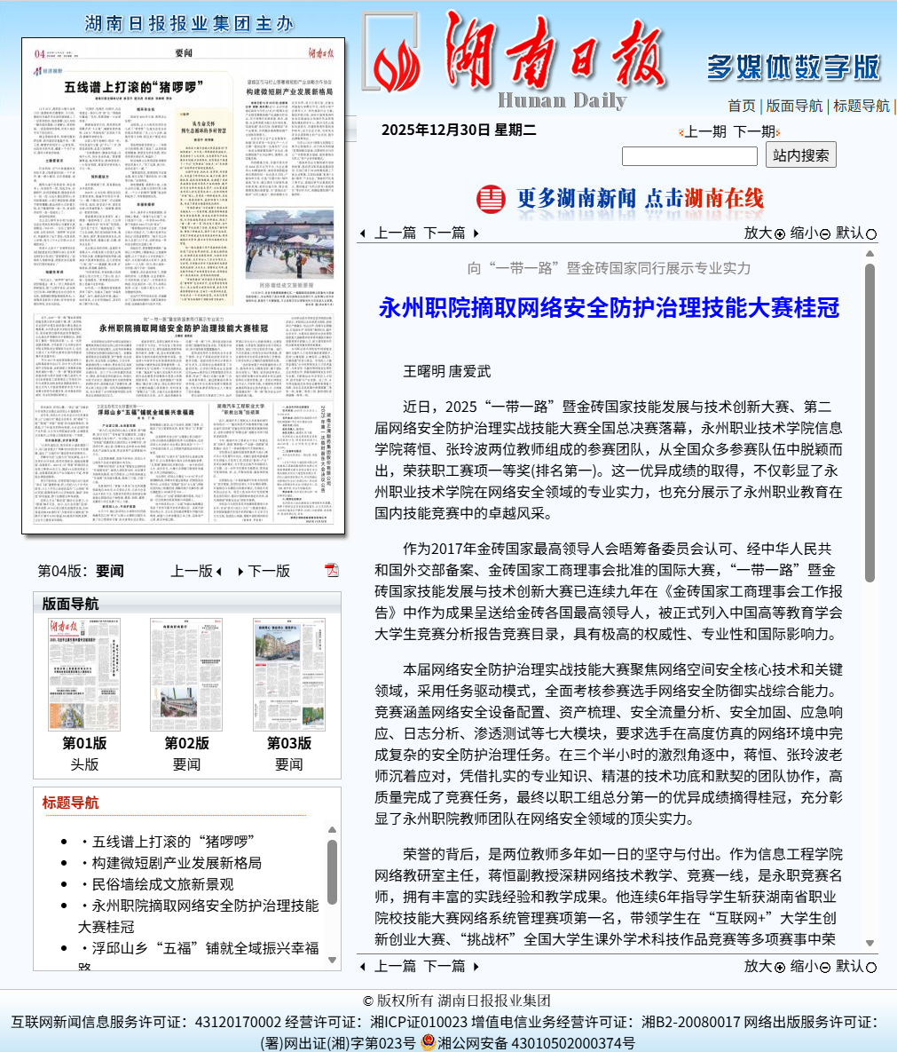 永州职院摘取网络安全防护治理技能大赛桂冠-----湖南日报数字报刊