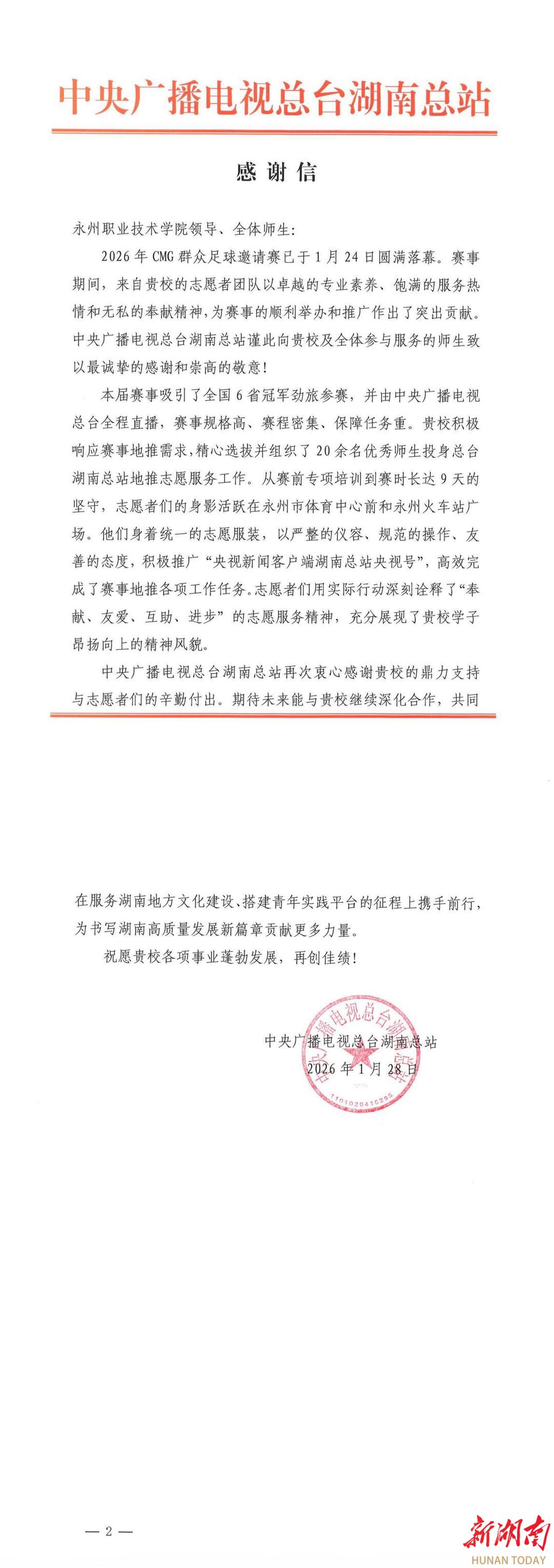 湖南日报·新湖南客户端1月29日讯(通讯员 王曙明 唐新宇)1月28日,中央广播电视总台湖南总站向永州职业技术学院发来感谢信,对学校师生在2026年CMG群众足球邀请赛期间志愿服务工作给予高度评价。