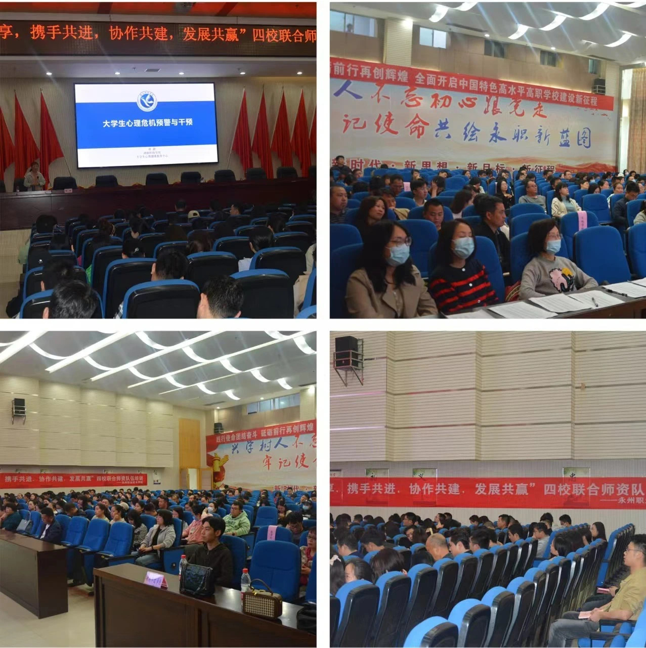 为深入学习党的二十大精神,贯彻落实立德树人的根本任务,以湖南省心理健康教育示范中心建设为契机,提升我校学工队伍的心理健康素养和心理危机预警及干预能力,切实提升我校心理育人的实效,营造一个安全稳定,温馨和谐的校园文化氛围,4月11日下午,我校开展了“资源共享,携手共进,协作共建,发展共赢”四校合作师资培暨2023年永州职业技术学院第一期学工队伍师资培训。出席本次培训的领导老师有我校党委委员,副校长欧阳正晟,学工部书记秦润华,副部长汤锦军,各二级学院书记,副书记,学工办主任。辅导员班主任共计260余人参与了培训。