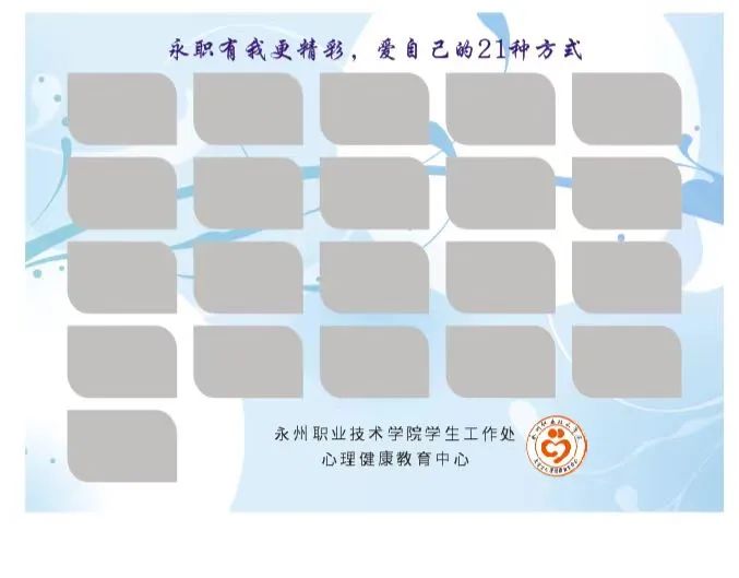 游戏规则:在各自学院报了名的同学到活动现场领取一张打卡刮刮乐(每天刮一个,按照刮出的内容去做相应的爱自己的行为,如:联系一个多年未联系的好友),同时现场扫码进打卡群,进群后按【序号-班级-姓名】的格式修改群昵称,如:1-23级学前1班-张三。记录方式为“朋友圈打卡+微信群打卡”。具体要求:在比赛的21天时间里需每天发一条朋友圈记录每天爱自己的行为,配文模板:我在参加永州职业技术学院2024年525大学生心理健康教育月“永职有我更精彩,爱自己的21种方式”打卡活动+自己要发的内容。如:我在参加永州职业技术学院2024年525大学生心理健康教育月“永职有我更精彩,爱自己的21种方式”打卡活动,联系一个多年未联系的好友完成。同时配上活动指定图片2张(一张活动宣传图和一张自己在活动现场的照片)+其他图片或视频记录。参与人员需在每天22:00前将自己当天发的这条朋友圈截图发打卡群,我们会有工作人员在群内记录大家的打卡情况。连续三天未按要求打卡者视为自动放弃比赛,完成打卡的均可获得心理中心精美文创产品一份。
