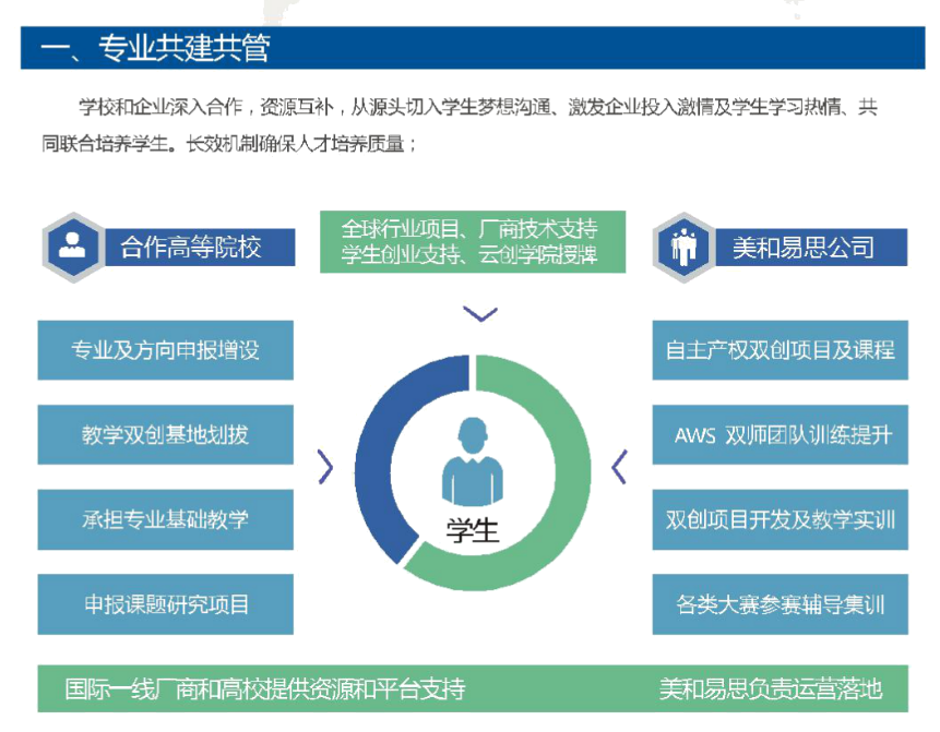 美和易思以“用爱和科技推动中国高等职业教育创新与发展”作为毕生使命,将打造一个“自我实现、受人尊重、成就梦想”的平台作为奋斗愿景,致力于为各合作院校提供招生、学术、学工以及就业等一揽子服务,旗下拥有两家软件外包企业,并与5000余家知名IT企业保持用人合作关系。公司深入贯彻教育部“立德树人”的人才培养理念,定位为高等职业教育层次,以提升人才培养质量为保障、以高质量就业为目标的校企合作新模式,截至2017年已经协助合作院校为社会培养了超过50000名优秀IT软件人才,受到了学生、高校和用人企业的一致好评,客户口碑和公司品牌持续提升。